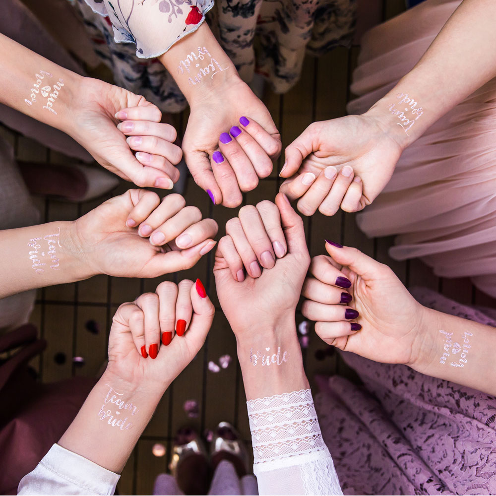 Med temporära tatueringar kan den blivande bruden och hennes vänner göra sig lite extra snygga inför möhippan! Här får du hela 12 stycken gnuggis tatueringar med texterna "Bride", "Maid of Honor" och "Team Bride" att utsmycka kroppen med. Dessa möhippa tatueringar är även super enkla att använda, klipp enkelt ut valfri tatueringen, applicera den på kroppen med vatten, vänta ca 30 sekunder och dra bort pappret så är tatueringen klar. De perfekta gnuggis tatueringarna för dig som är på jakt efter riktigt snygga möhippa tillbehör och accessoarer.