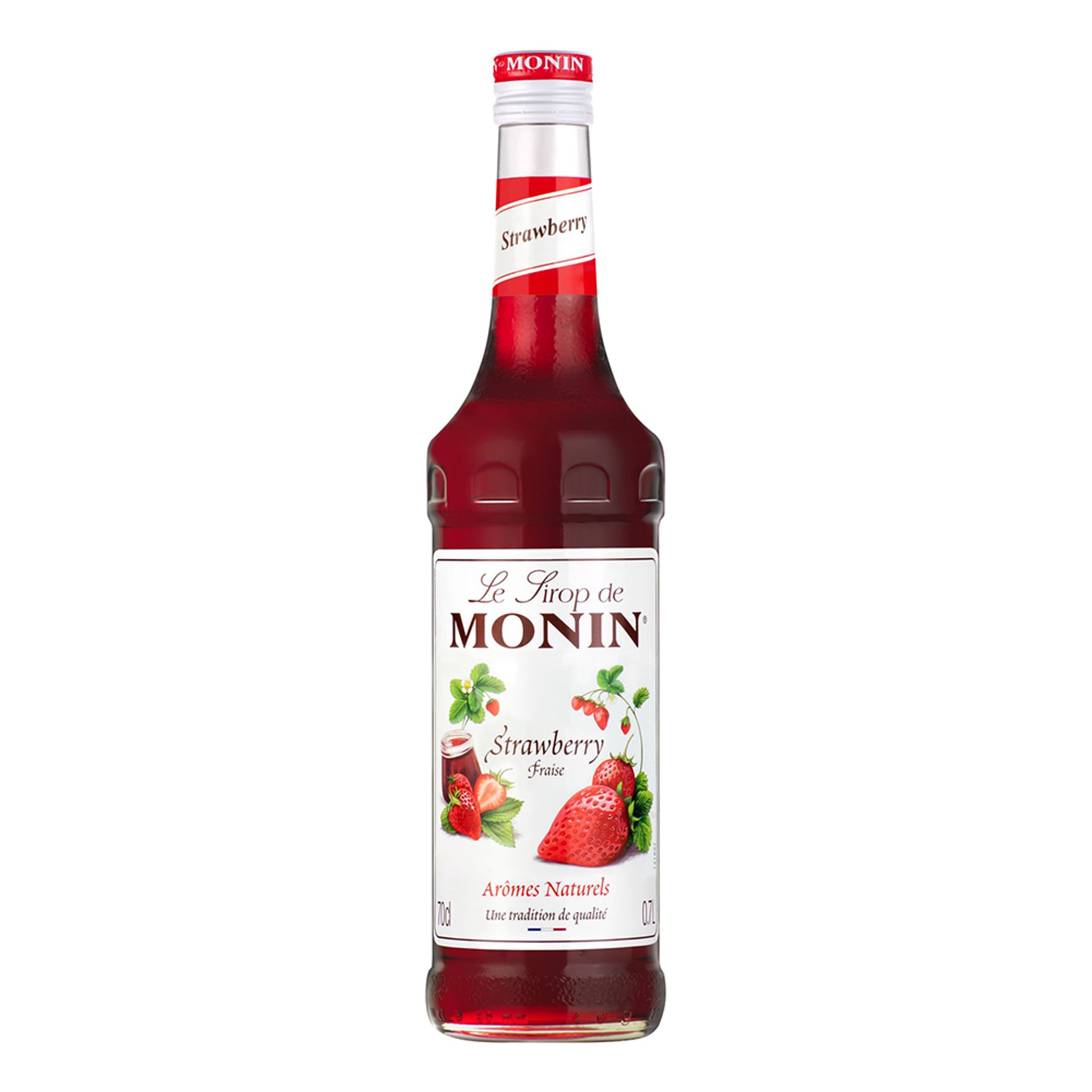 Monin Jordgubbe Syrup är en glasflaska som innehåller söt jordgubbssirap som passar för en rad olika drinkar.