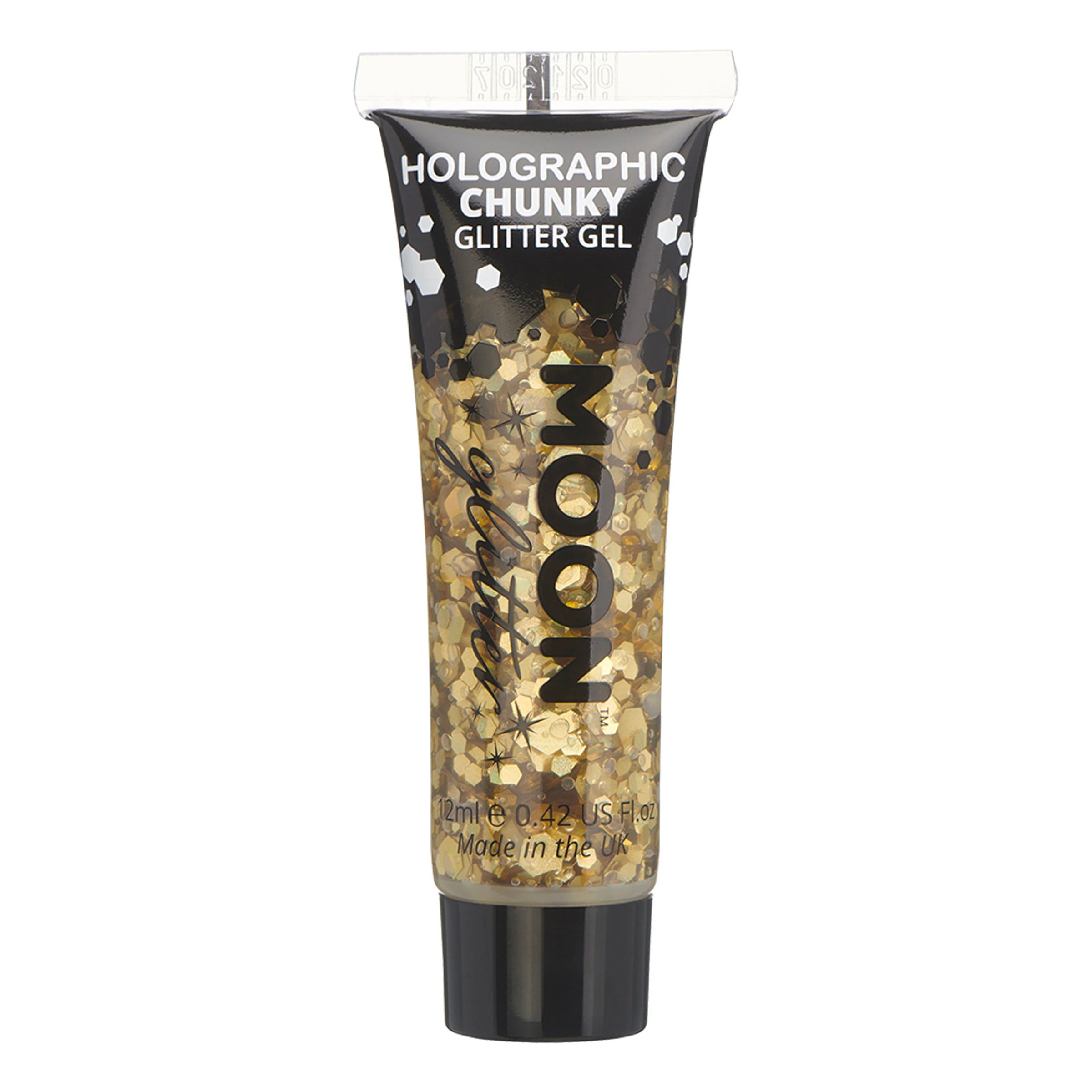 Moon Creations Holographic Chunky Glitter Gel innehåller en tub med 12 ml glittrande gel. Kan appliceras på huden, men var försiktig runt ögon/mun. Finns i 7 olika färger. Säljs styckvis.