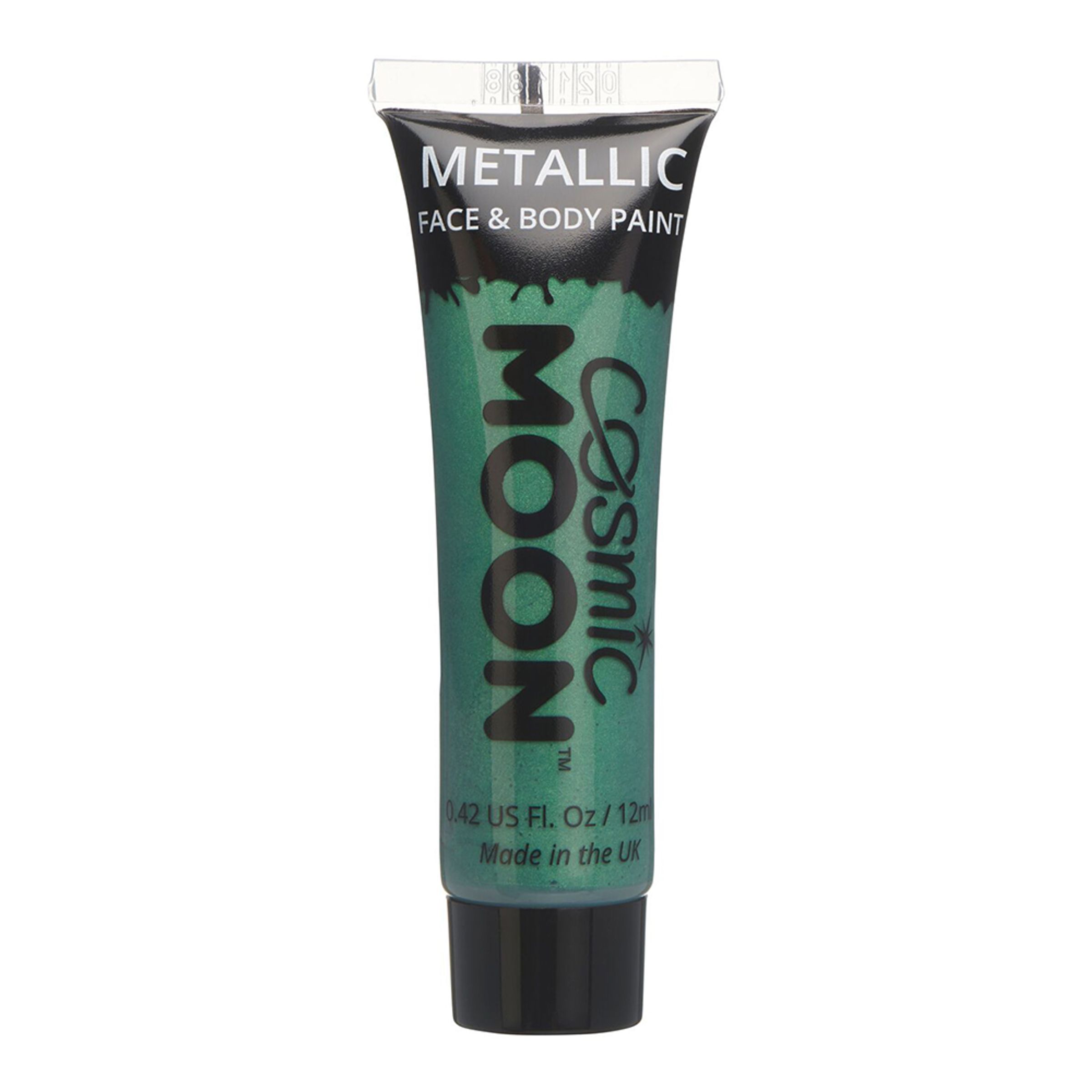 Moon Creations Metallic Ansikts- & kroppsfärg levereras styckvis i tub om 12 ml och finns i åtta olika färger, närmare bestämt Silver, Guld, Roséguld, Rosa, Röd, Grön, Blå och Lila. Varje tub innehåller matt metallicfärg som passar lika bra till halloweenfesten som till partyt med steampunktema, men också till barnkalassminkningen. Sminket är icke testat på djur.