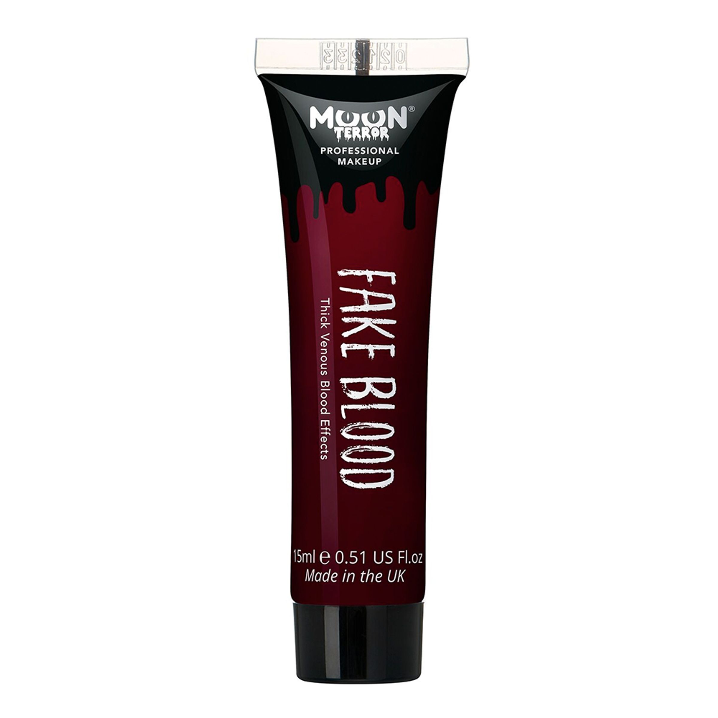 Blöd som aldrig förr – med Moon Creations Pro FX Fake Blood. Detta blod, som är trögflytande, ser väldigt äkta ut kan lätt misstas för verkligt blod. Blodet kommer i en tub om 15 ml och räcker till en hel del sminkningar.