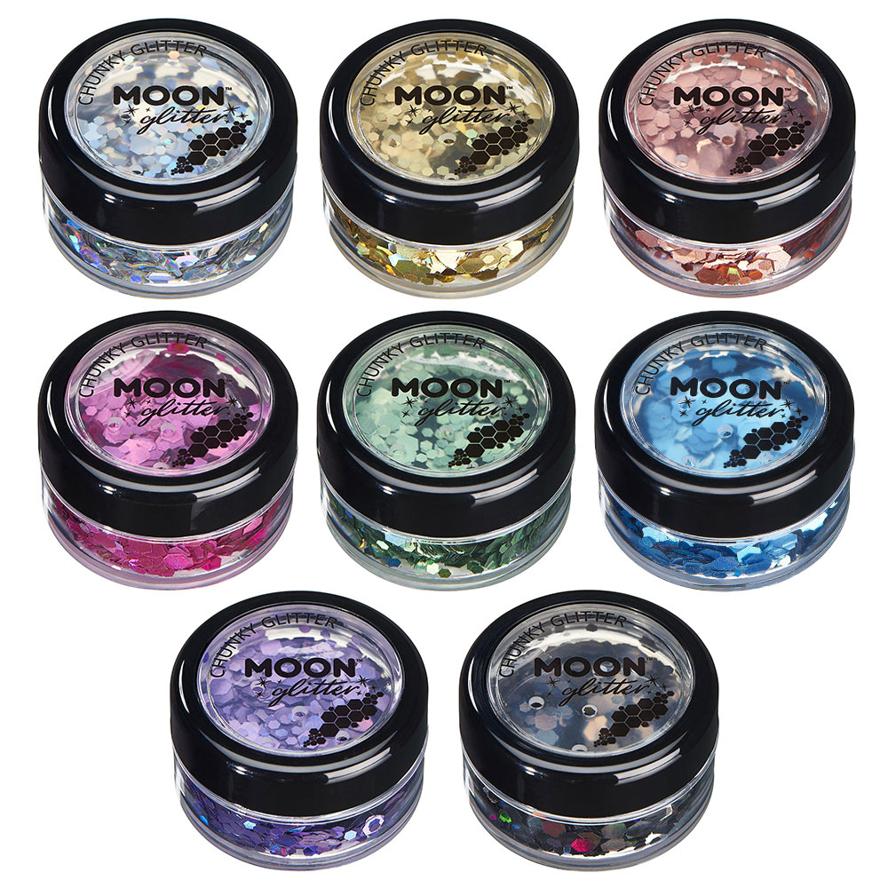 Moon Glitter Holografiskt Chunky Glitter består av en burk med Vegansktt biologiskt nedbrytbart lösglitter med ett holografiskt skimmer för hår, ansikte och kropp. Rekommenderas att appliceras med glitterlim.