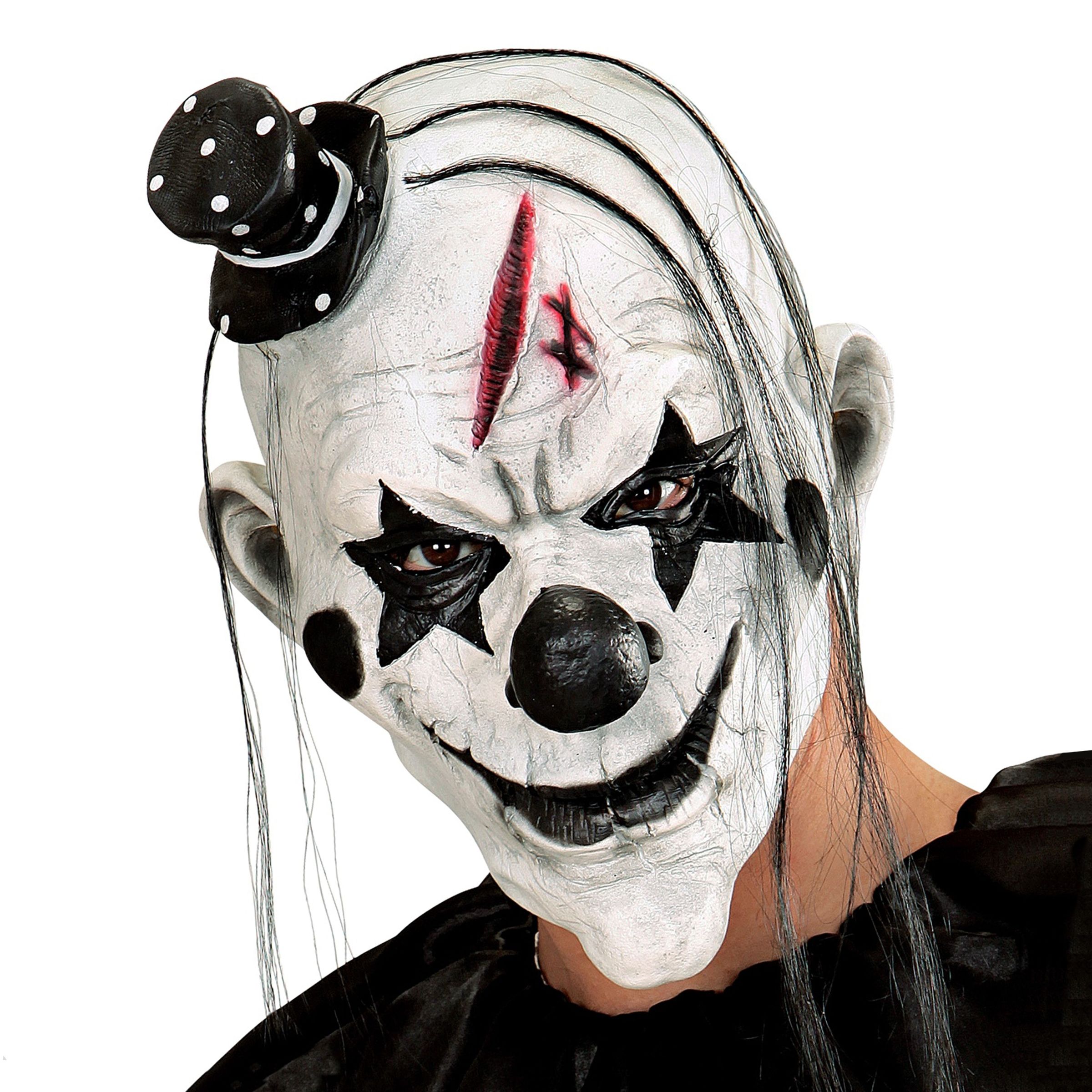 Mördar Pierrot Mask är en vit latexmask med ett clownansikte med svart clownsmink och sår i pannan. På masken finns också en minihatt och några långa svarta hårslingor. Masken täcker 3/4 av huvudet och finns i en storlek som passar vuxna. Det är bara masken som ingår, inget annat som syns på bilden.