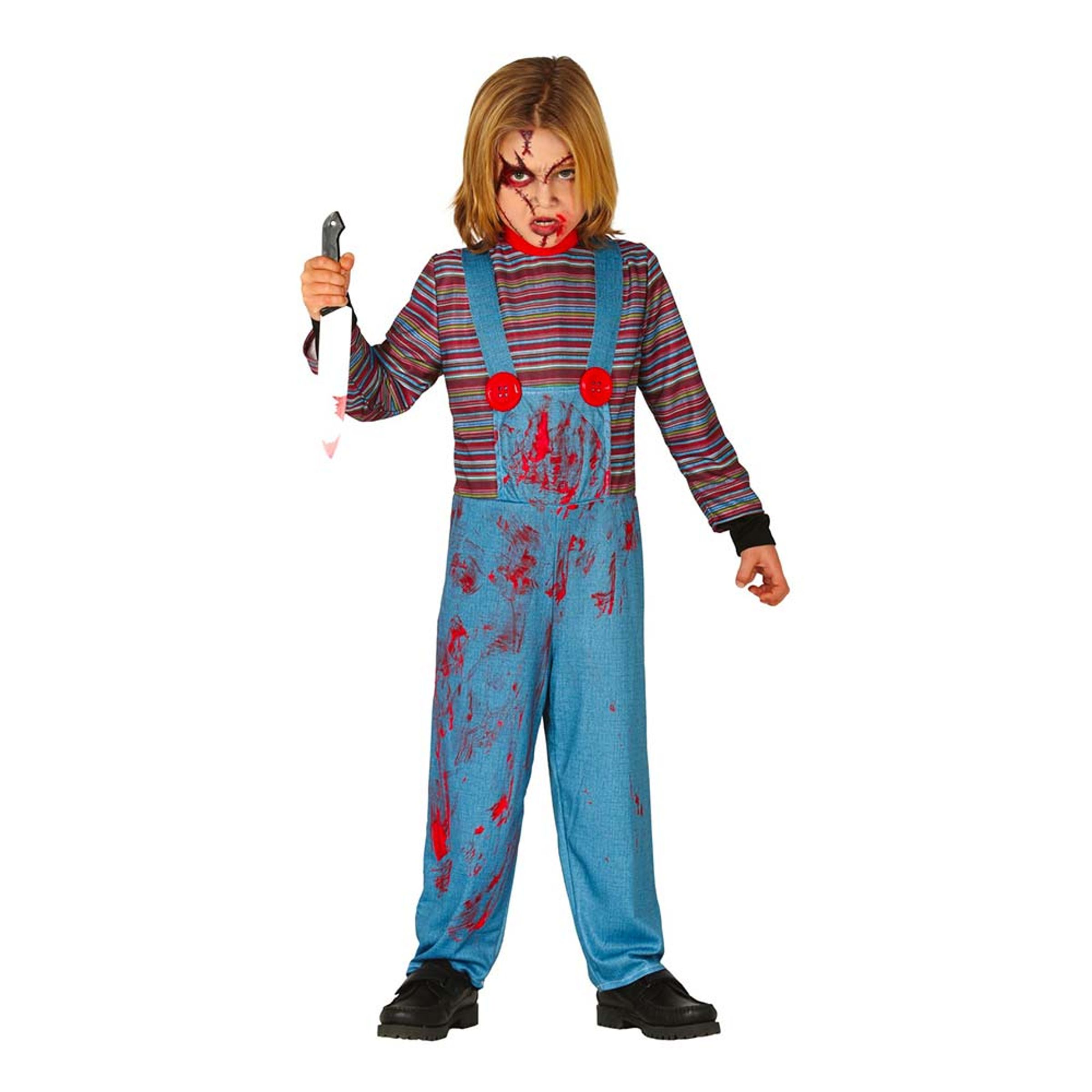 Mördardocka Barn Maskeraddräkt inkluderar en blodig overall med långa ärmar, fastsydda hängselbyxor och röda knappar. Köp till smink och kniv för att få den look som på bilden. En klockren barndräkt för att efterlikna Chucky till det extra läskiga halloweenkalaset!