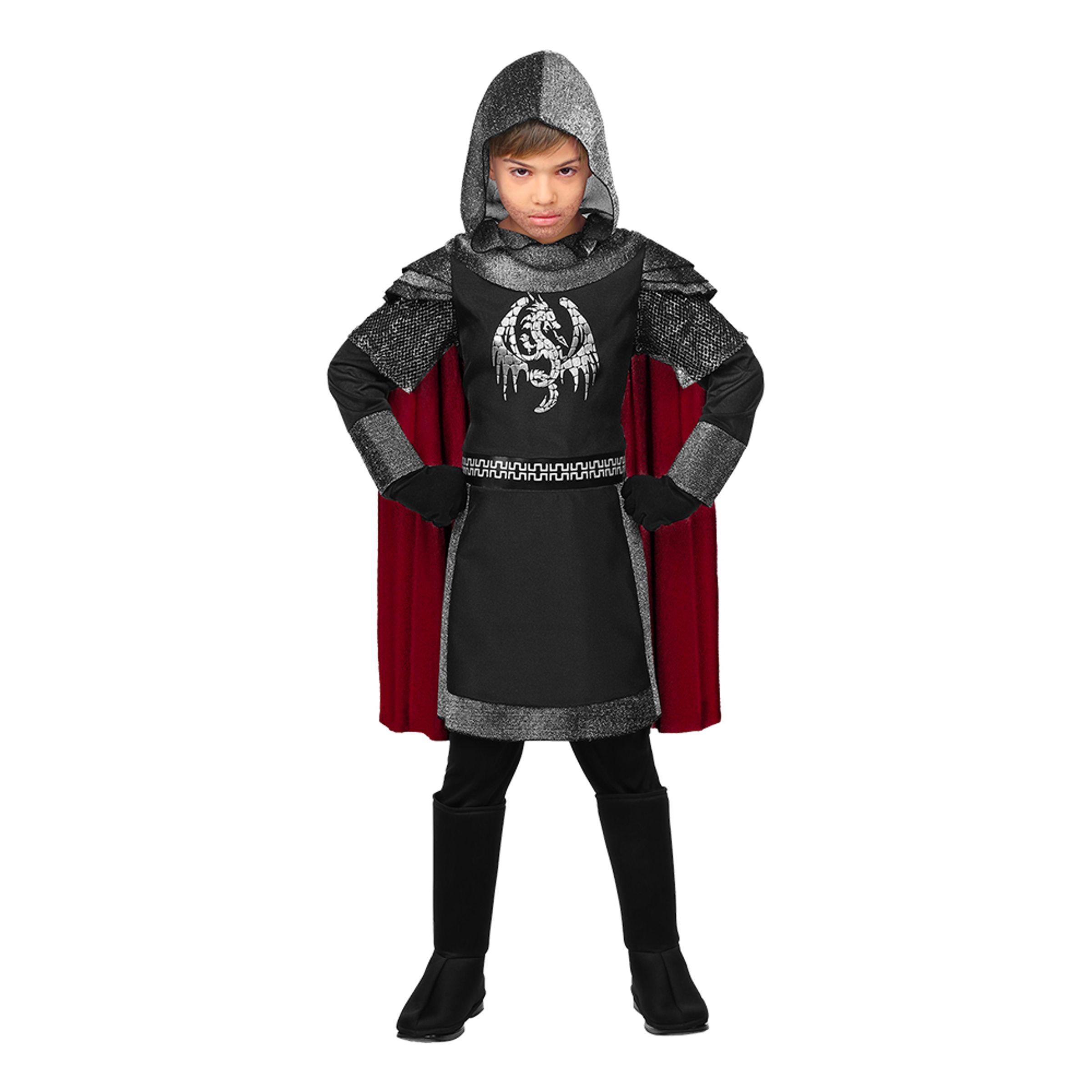 Mörk Medeltida Riddare Barn Maskeraddräkt inkluderar en svart och grå kappa med silvriga detaljer och huva samt cape. Komplettera gärna med ett svärd så är ni redo för barnmaskeraden!