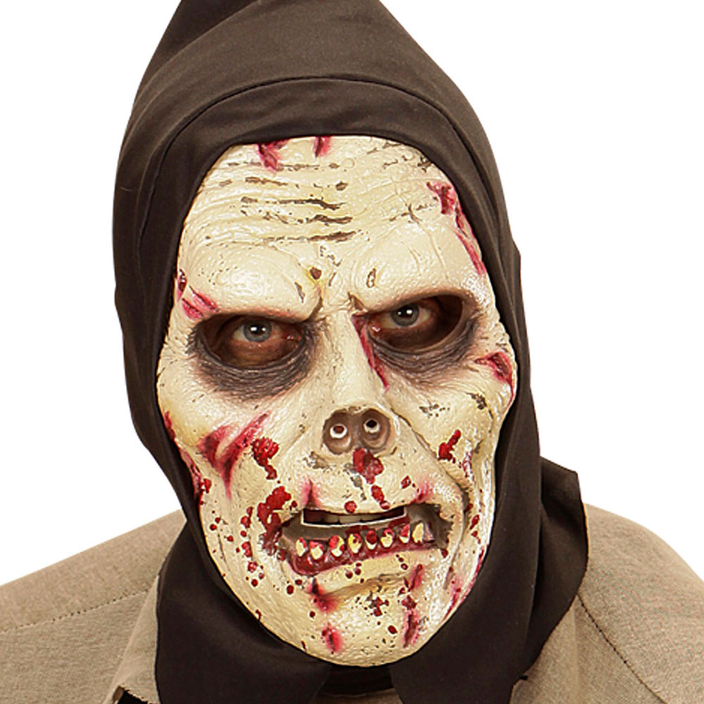 Mörk Zombiemask med Huva omfattar en detaljerad mask i ett hårt skum i en grå färg med blodstänk, sår och rynkor och sitter fast i en svart huva. Masken har hål för ögon, mun och näsan och hålls på plats med huvan.