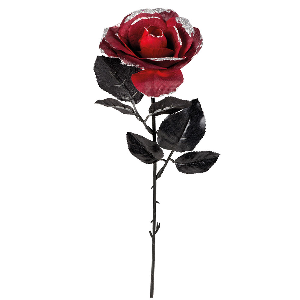 Den här tygrosen kan passa snyggt till vampyr maskeraddräkter och lite annat roligt, kanske vill du till och med ge den till din älskade, med sin mörkröda färg kommer den att imponera på de flesta. Tygblommor kanske inte är lika populära som riktiga rosor, men just denna konstgjorda ros har till och med glitter på, vem älskar inte glitter?