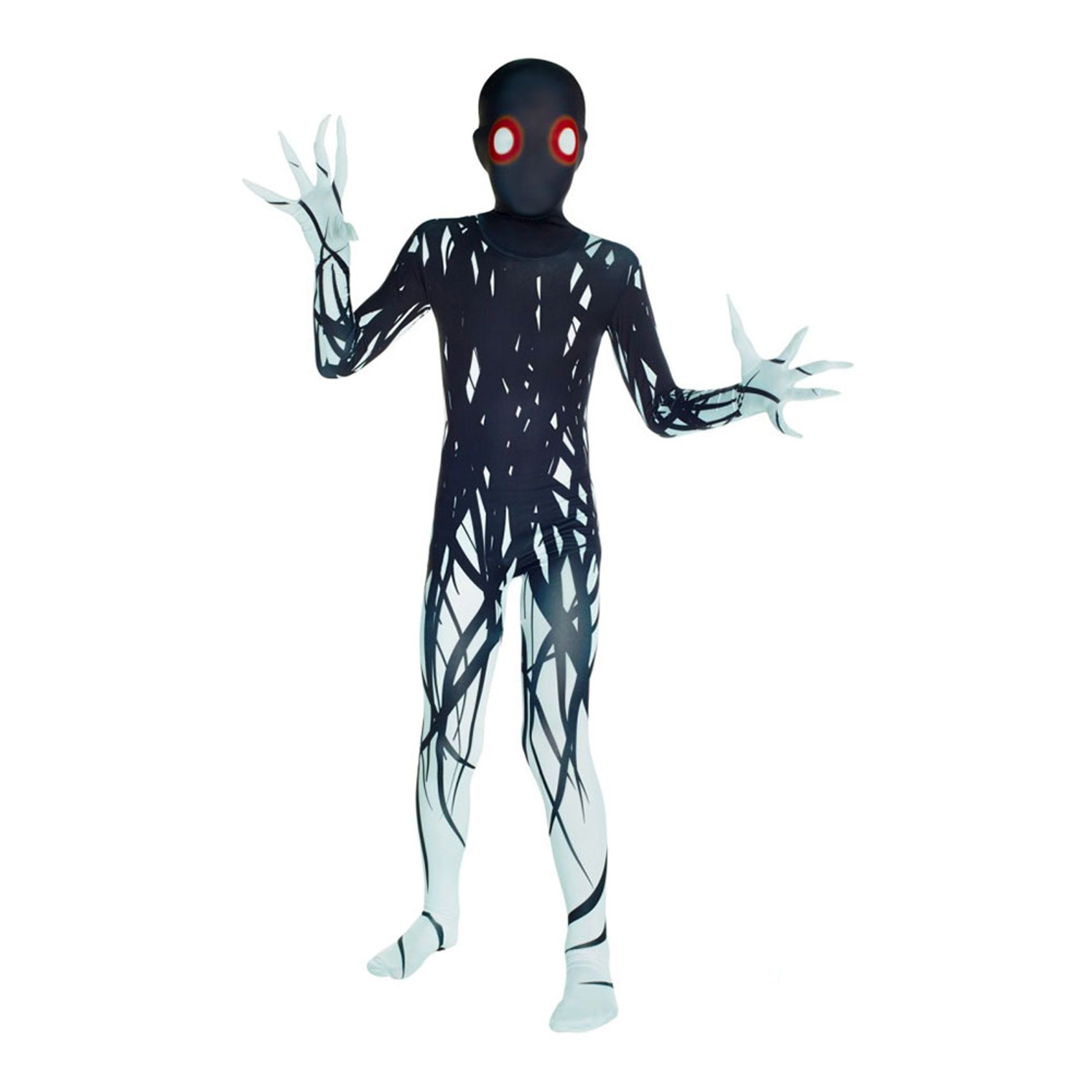 Morpshuit Zalgo Barn Maskeraddräkt är en svart/vit jumpsuit föreställande ingen mindre än internetlegenden Zalgo. Dräkten har långa och spetsiga fingrar och den svarta huvan har läskigt röda och vita ögon. Med denna maskeraddräkt kan man nästan skrämma livet ur vem som helst!