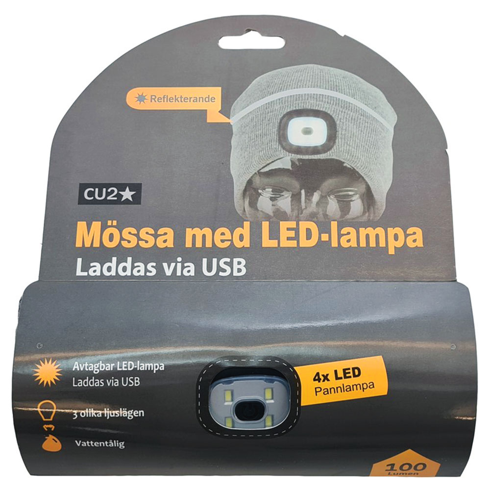 Mössa med LED Lampa omfattar en grå stickad mössa med en tunn LED lampa i en ficka och reflexband runt toppen. Lampan har tre olika lägen av ljusstyrka och kan tas ur mössan för att laddas via USB.