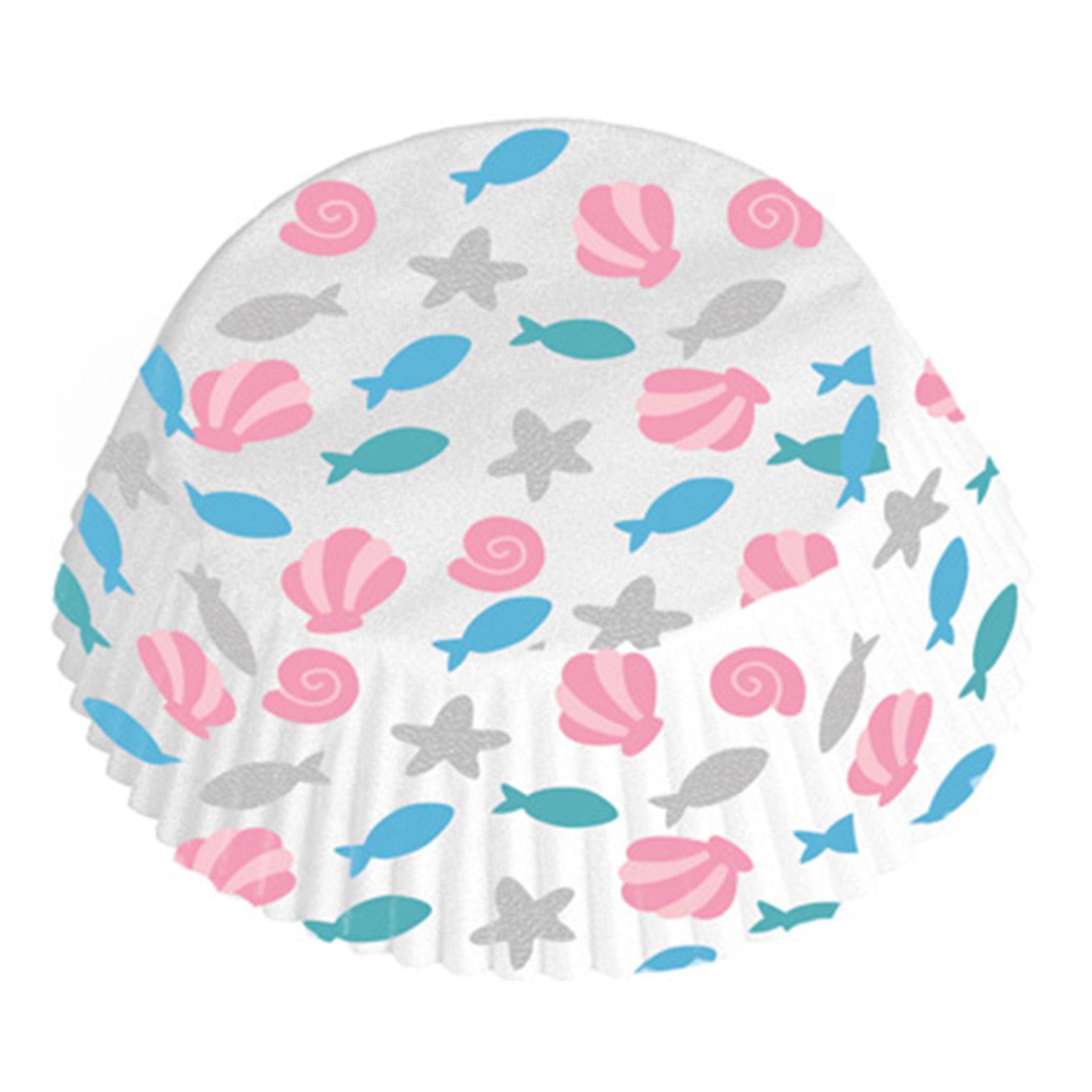 Muffinsformar Be a Mermaid inkluderar 48 stycken vita muffinsformar med motiv av snäckor och fiskar i blått, grått och rosa. Perfekt till kalaset med sjönjungfru-tema!