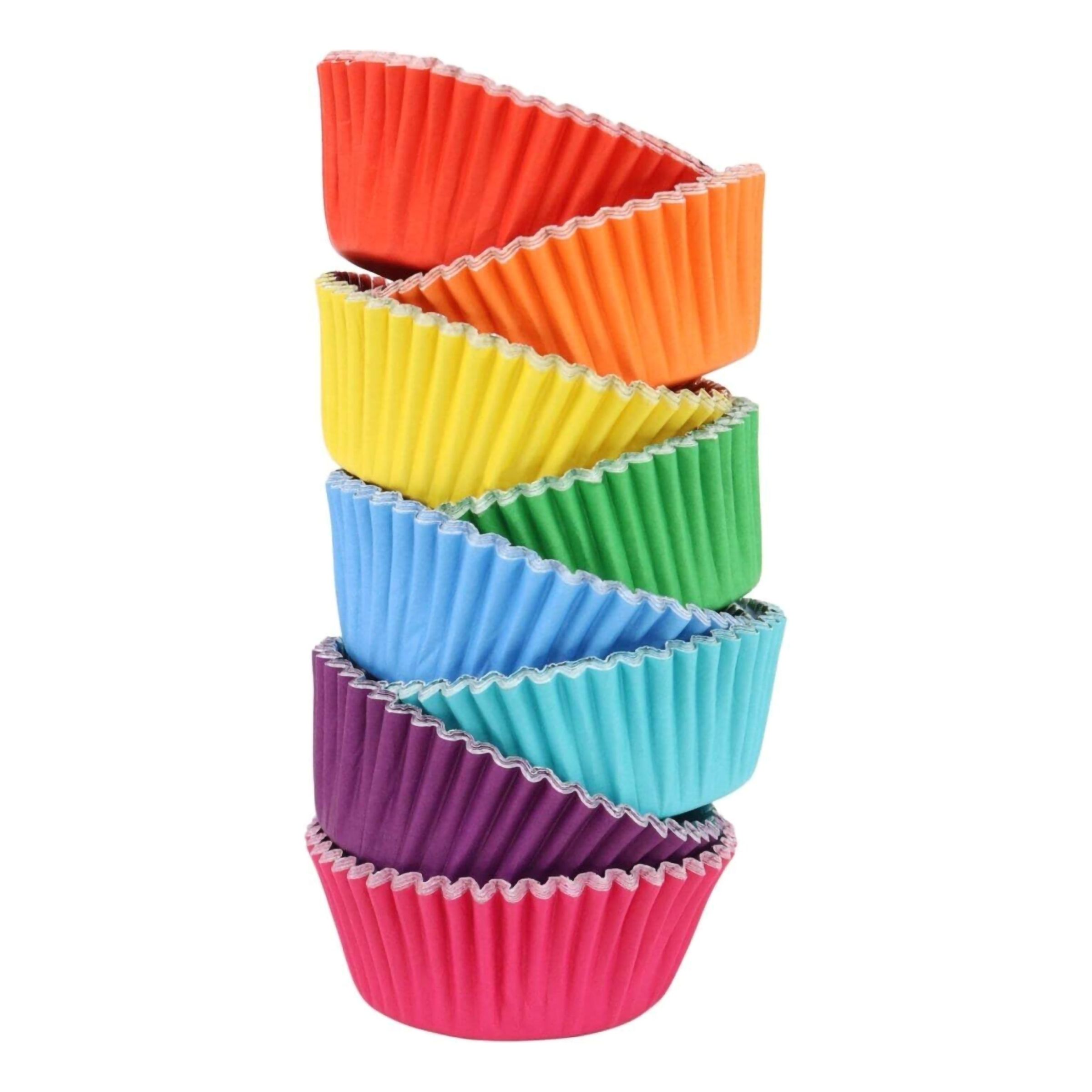 Muffinsformar Folierade Regnbåge inkluderar 100 stycken muffinsformar i färgerna röd, orange, gul, grön, blå, lila och rosa. Passar perfekt både till pride och barnkalaset!
