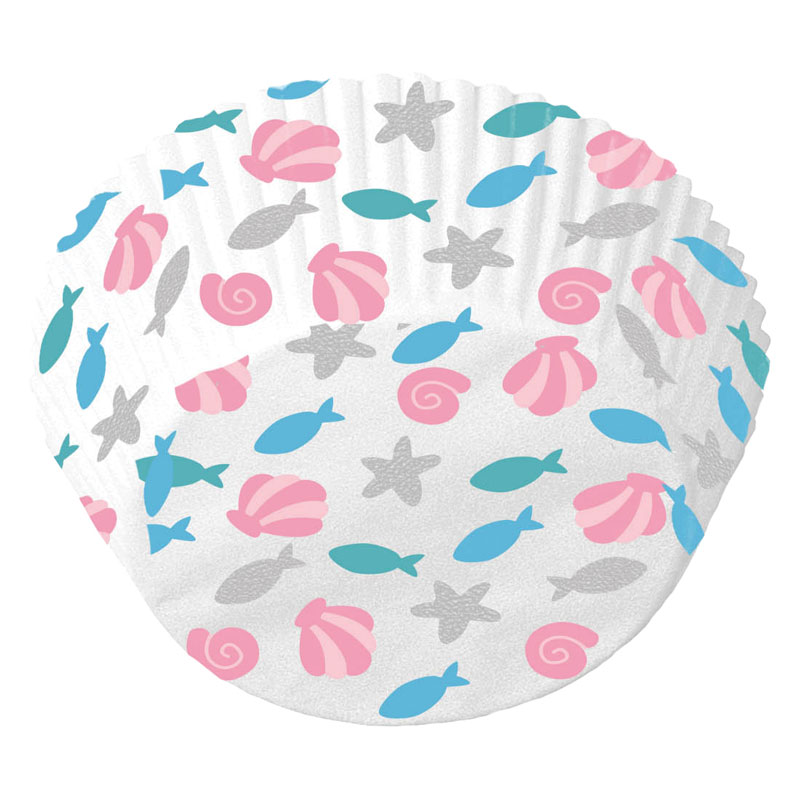 Muffinsformar Sjöjungfru är ett paket med super söta vita muffinsformar med motiv i rosa, blått och grått. Utmärkta formar att baka bullar, kakor, cupcakes och muffins med. Motiven är fina snäckor, fiskar och sjöstjärnor. Muffinsformarna tål max 220°C.