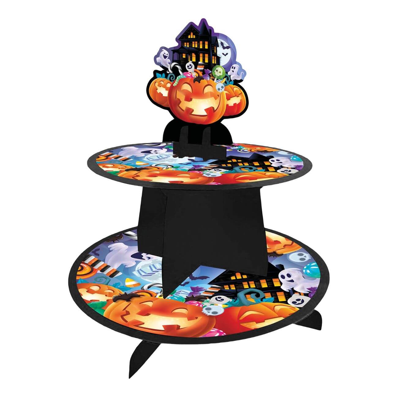 Ett muffinsställ som gör din Halloweenfest extra festlig. Stället är gjort i papper och monteras enkelt ihop. Motivet är ett lskigt hus med pumpor och spöken och har två våningar. Självklart kan du ställa andra saker än muffins på och är du försiktig med den kan du använda den fler gånger.