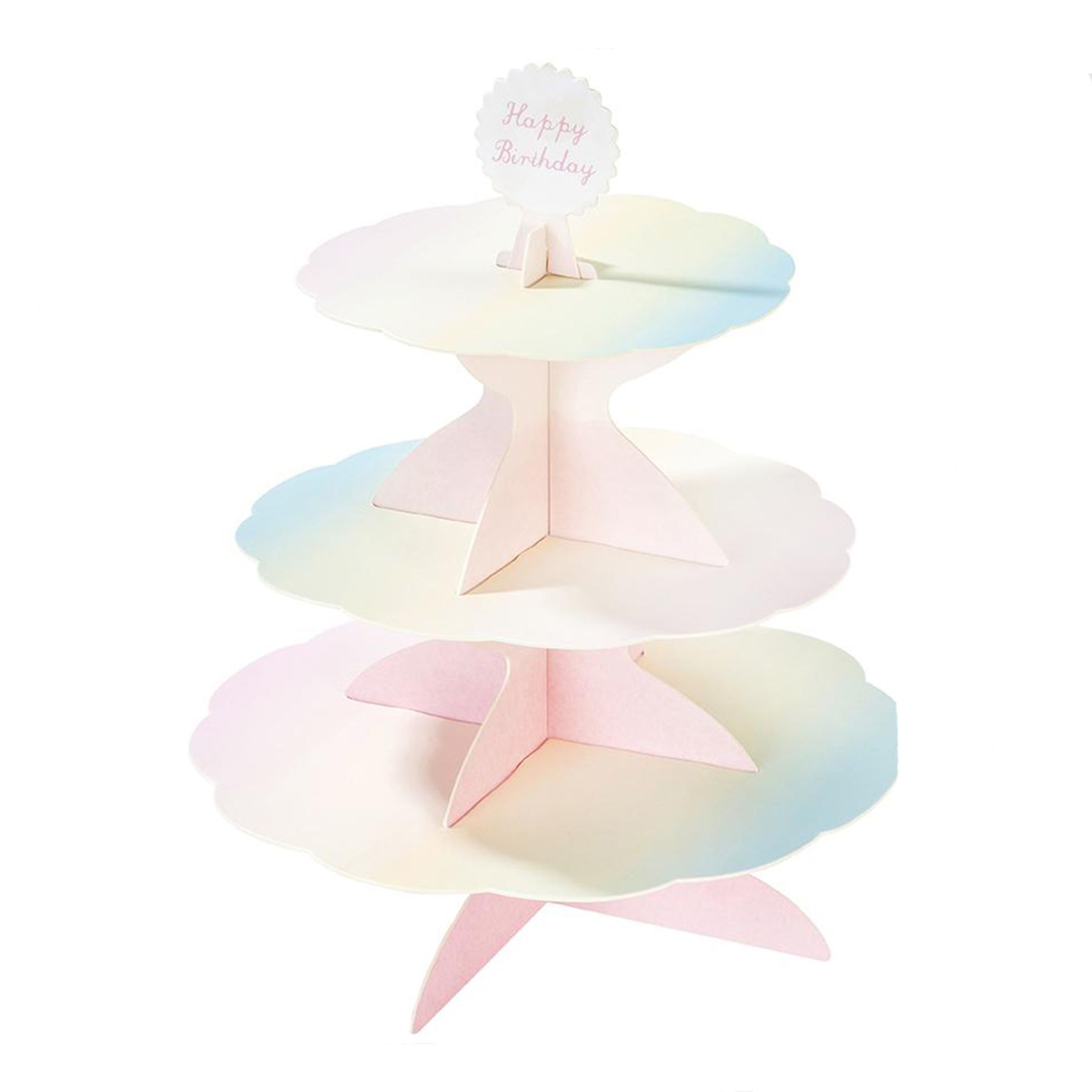 Muffinsställ Pastell levereras omonterat men är superenkelt att bygga upp. Muffinsstället kommer i pastellens sken och gör sig lika bra till småbarnskalas som till enhörningskalas och babyshowers. Medföljer gör fyra stycken olika "toppers" du fäster högst upp på stället, dvs en rosett med texten: "happy birthday", en guldig enhörning, en sjöjungfru och en svan. Stället är ett 3-lagers och tillverkat i papp.
