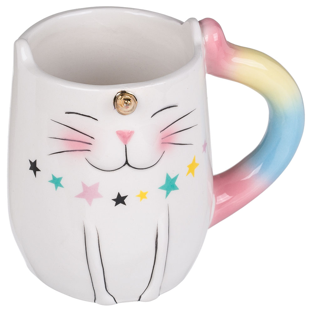 Mugg Enhörningskatt är en mugg med motiv av en katt med utputande guldfärgat enhörningshorn i pannan. Muggen är i vit keramik med färgade stjärnor och har ett flerfärgat handtag som ser ut att vara kattens svans. Endast handdisk.