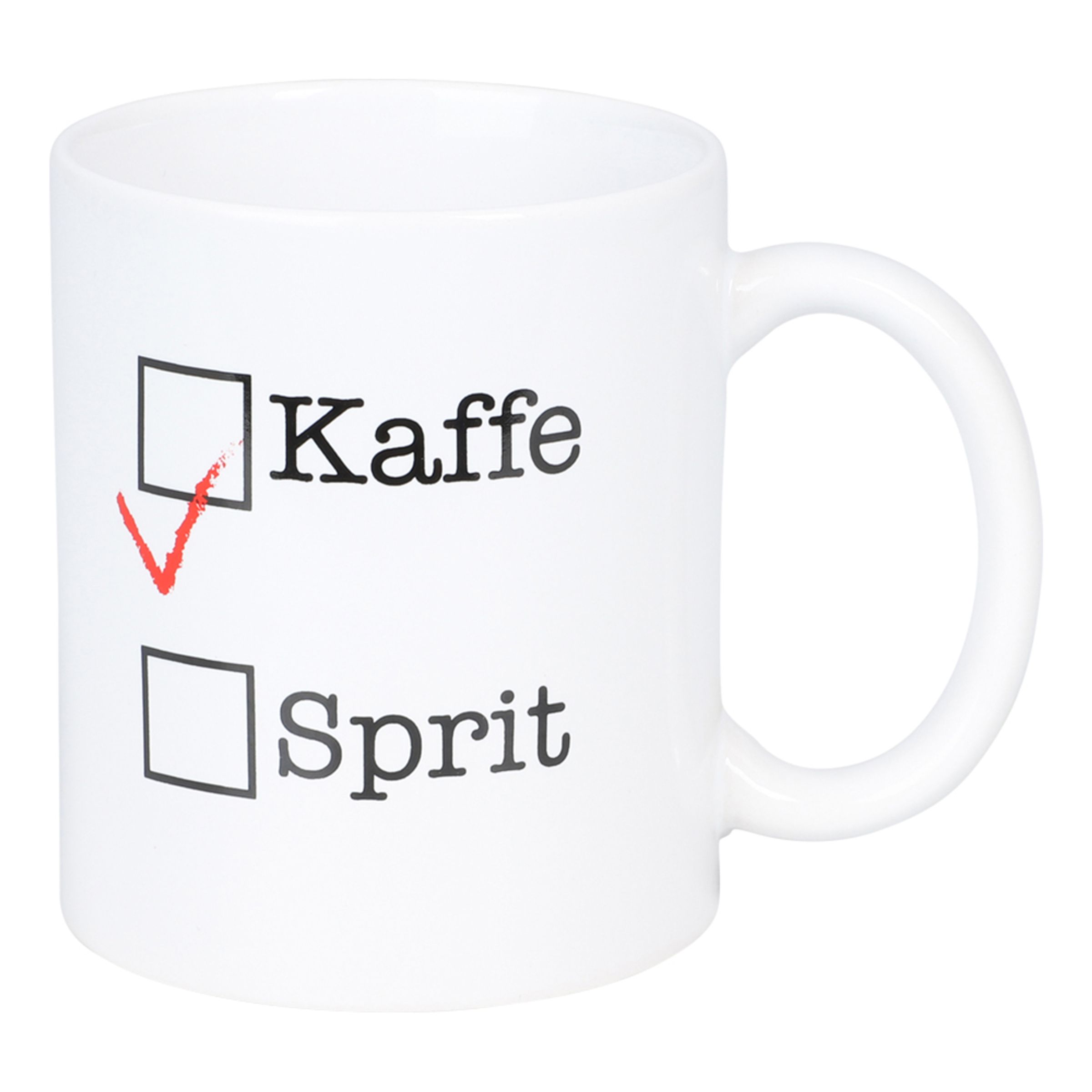 Mugg Kaffe eller Sprit är en vit mugg som kommer med två bockningsrutor och en checkmarkering utanför alternativen "kaffe" eller "sprit". Perfekt att ge bort som en rolig present eller för att skapa skratt på kontoret!