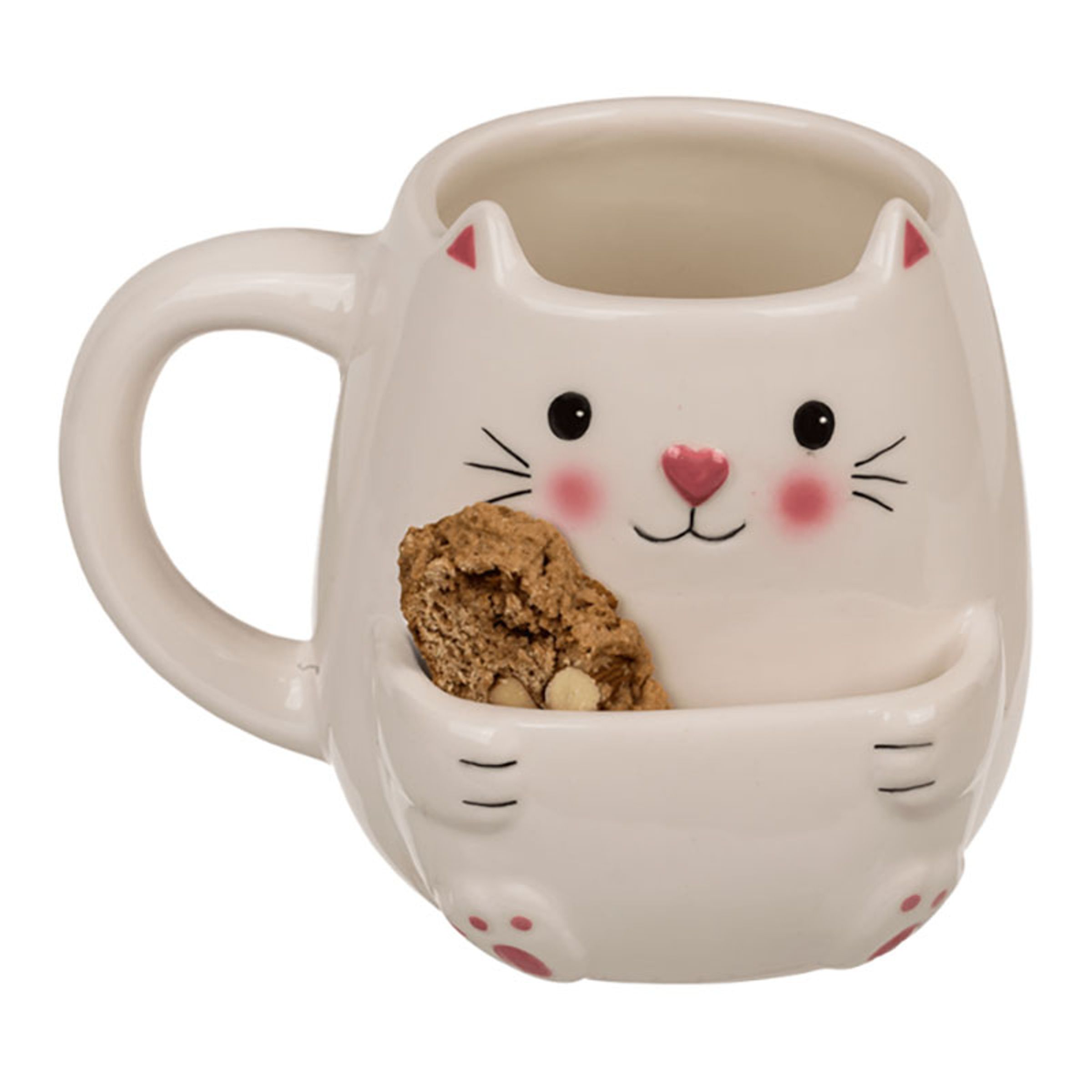 Mugg Katt Med Kakhållare är en mugg tillverkad i porslin. Muggen är i formen av en katt och har en ficka i fram med plats för en kaka eller sked. Muggen mäter 15 x 9 x 12 cm och rymmer 400 ml. Endast handdisk.