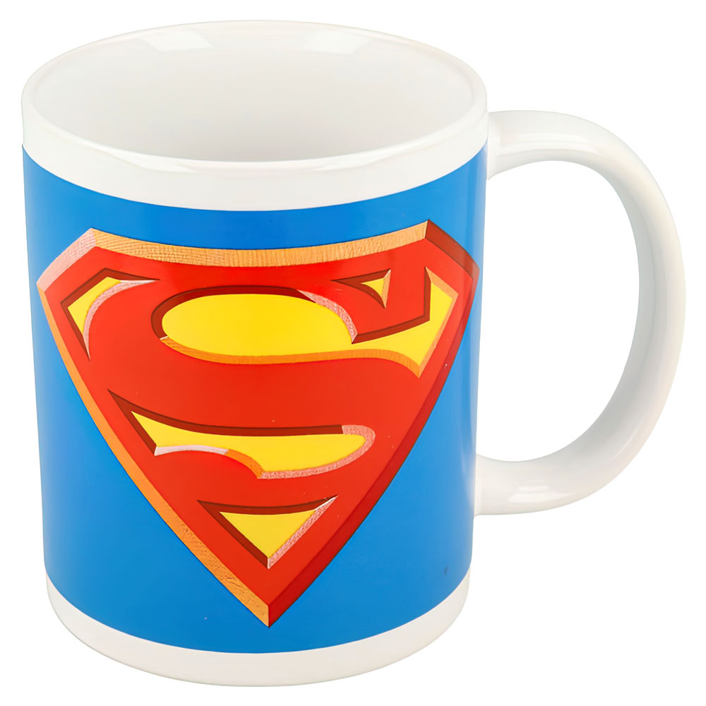 Mugg Superman omfattar en mugg i keramik med handtag och Superman motiv. Motivet är i form av det klassiska Stålmannen emblemet i rött och gult på blå bakgrund och vit kant. Muggen tål mikro och diskamskin och rymmer 325 ml.