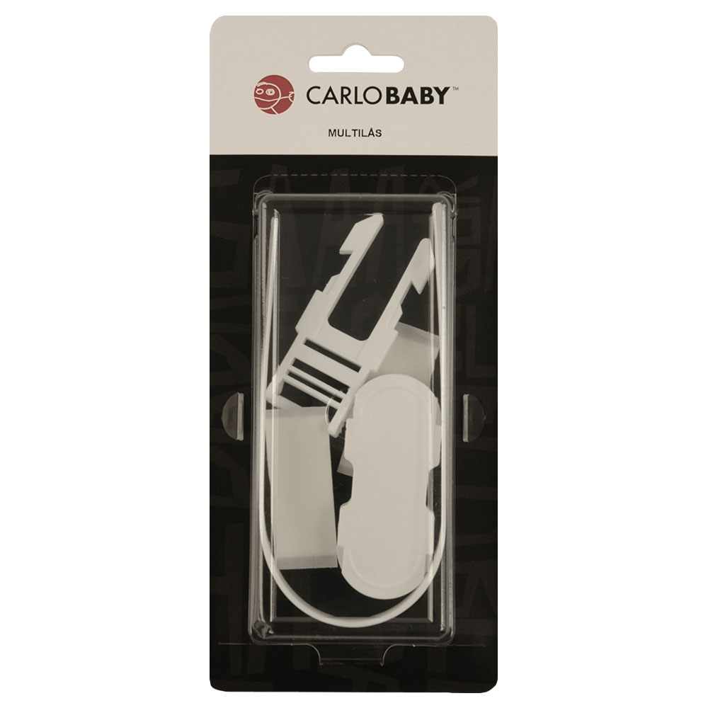 Multilås Vit omfattar ett vitt lås som används för att låsa exempelvis lådor, toalettstolar och kylskåp. Låset fästs med dubbelhäftande tejp.