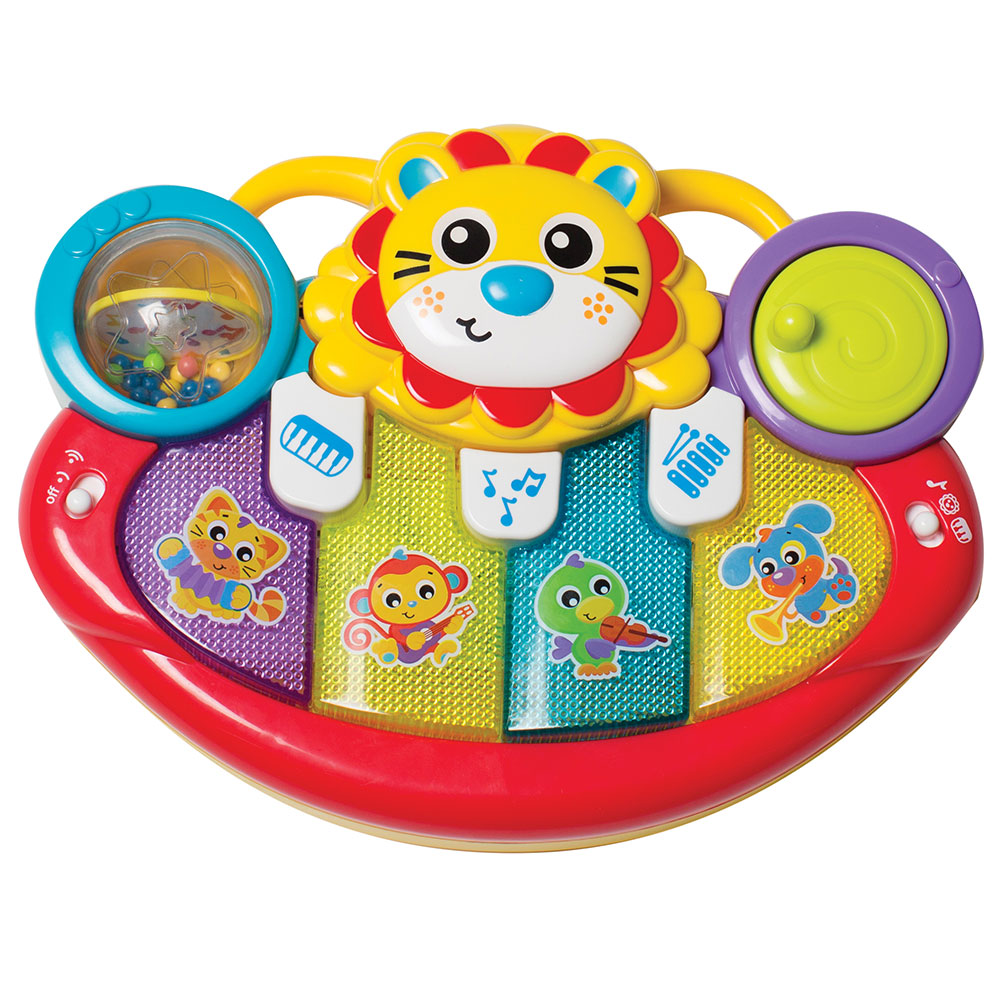 Musikleksak Piano Djur omfattar en musikleksak i form av ett piano med tjugo olika djurläten och melodier samt ljus som blinkar i takt med musiken när knapparna trycks. Aktivitetsleksak innehåller även en skallra och är dekorerad med ett lejonhuvud och andra djur.