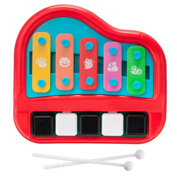 Musikleksak Piano/Xylofon omfattar en musikleksak i röd och turkos med piano och xylofon i ett.