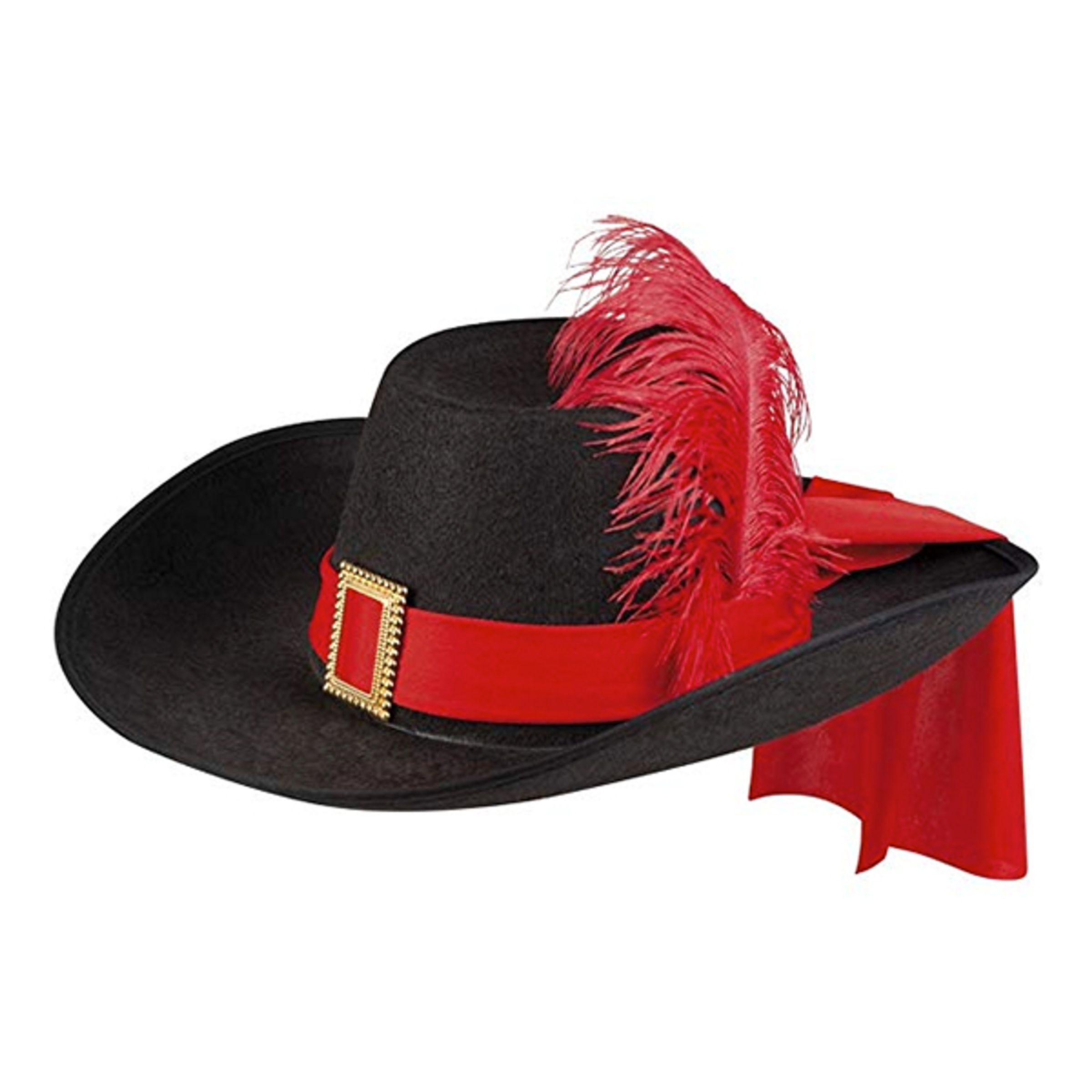Komplettera din musketördräkt med den här tjusiga hatten och sedan är din förvandling till en musketör komplett. Den här hatten har allt: snygg form, ett band prytt med ett spänne och en ståtlig plym. Nu är du en av de tre musketörerna så då är det dags att börja leta efter de andra två. Alla för en och en för alla, eller hur?