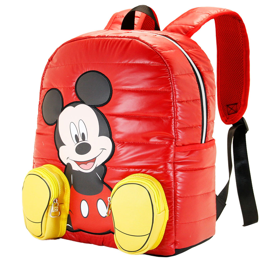 Musse Pigg Ryggsäck omfattar en vadderad röd barnryggsäck med Musse Pigg motiv. Ryggsäcken har ett bärhandtag, justerbara vadderade axelband, två sidofack och tre fack med dragkedjor, inklusive ett huvudfack och två framfack.