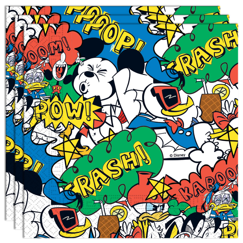 Musse Pigg Super Cool Servetter innehåller färgglada servetter med häftigt motiv av Musse Pigg och Kalle Anka, samt texterna "Pop!", "Boom!", "Pow!", "Crash!" och "Kaboom!" i bubblor. Servetterna har 2 lager och är tillverkade i papper.