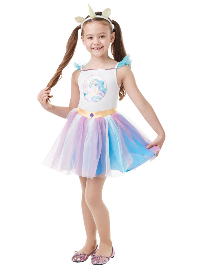 Bli den söta lilla prinsess-ponnyn Celestia från My Little Pony med denna vackra dräkt! En riktigt fin My Little Pony klänning med matchande diadem som blir både en fin utklädnad till maskerader och en tjusig kalas-klädsel.