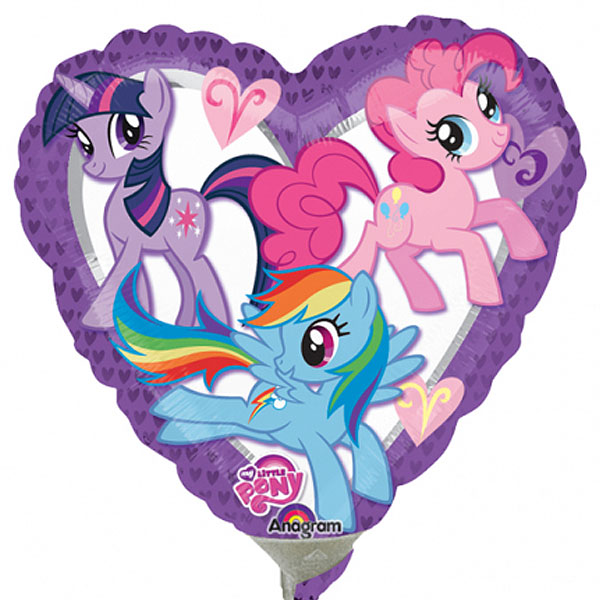 My Little Pony Hjärtballong Folie omfattar en lilafärgad folieballong format som ett hjärta med karaktärerna Twilight Sparkle, Rainbow Dash och Pinkie Pie tryckta på bägge sidorna. Dessa ballonger bör endast fyllas med luft. Storlek: ca 32cm (H) x 23cm (B).