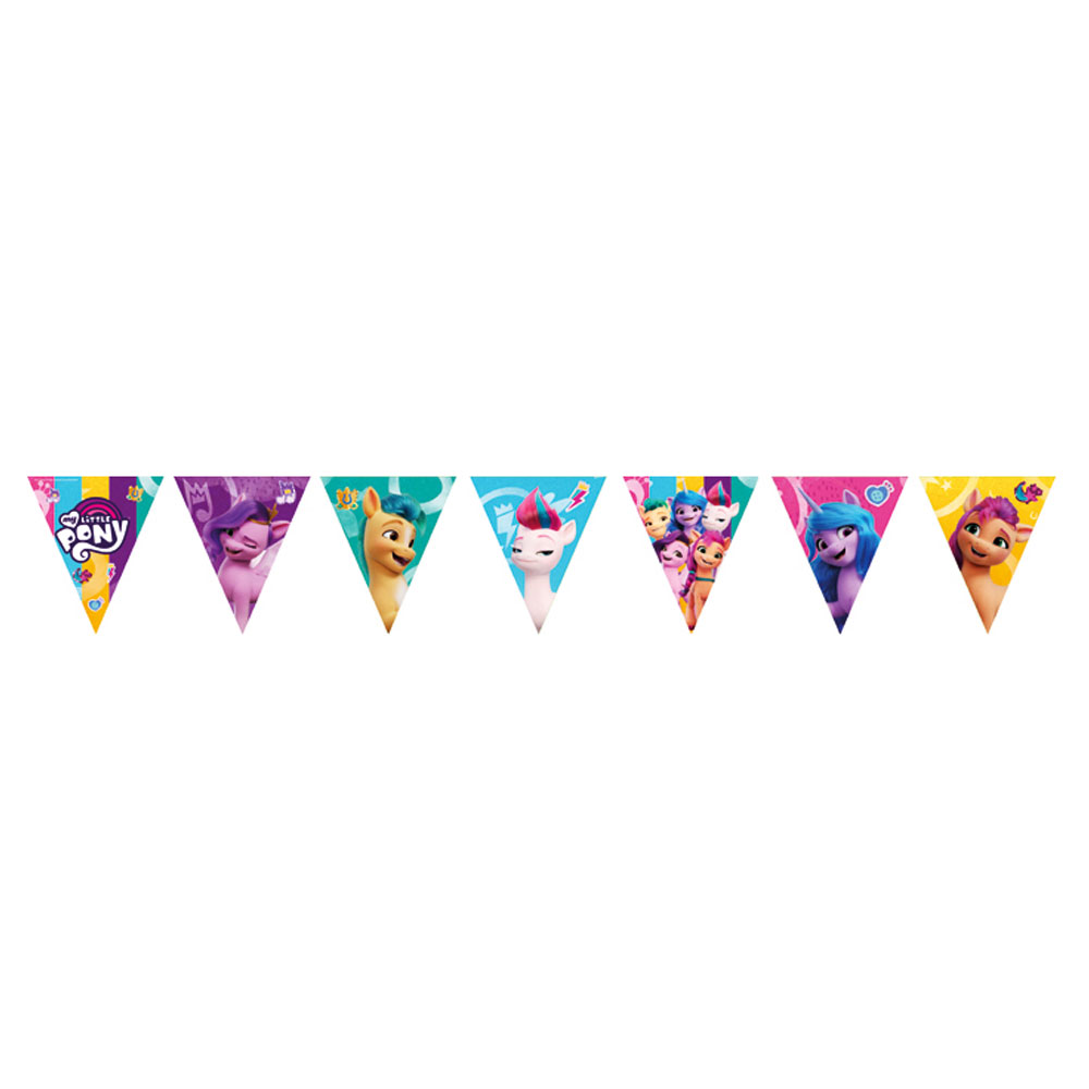 My Little Pony The Movie Flaggirlang omfattar en girlang med flaggor med "My Little Pony" text och färgglatt motiv av hästkompisarna. Flaggorna är ca 24,5 cm höga och girlangen är ca 3,3 meter lång. Tillverkad i papper.