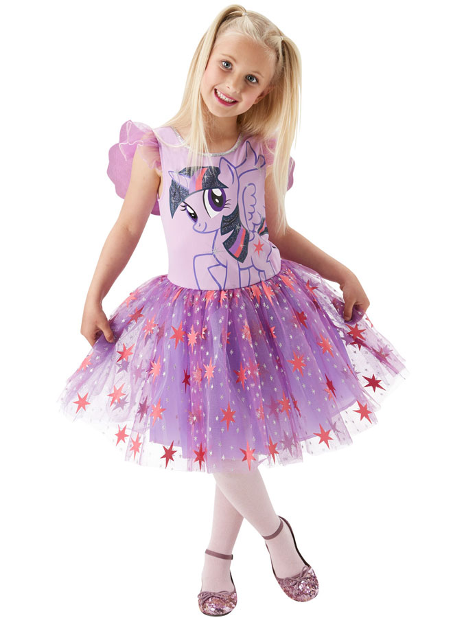My Little Pony Twilight Sparkle Klänning omfattar en ärmlös klänning med My Little Pony karaktären, Twilight Sparkle, tryckt framtill. Kjolen består av en lilafärgad underdel med par lager tyll ovanpå som har detaljer av röd- och silverfärgade stjärnor tryckta omkring. Det medföljer dessutom ett par avtagbara, lilafärgade vingar med glitterdetaljer.
