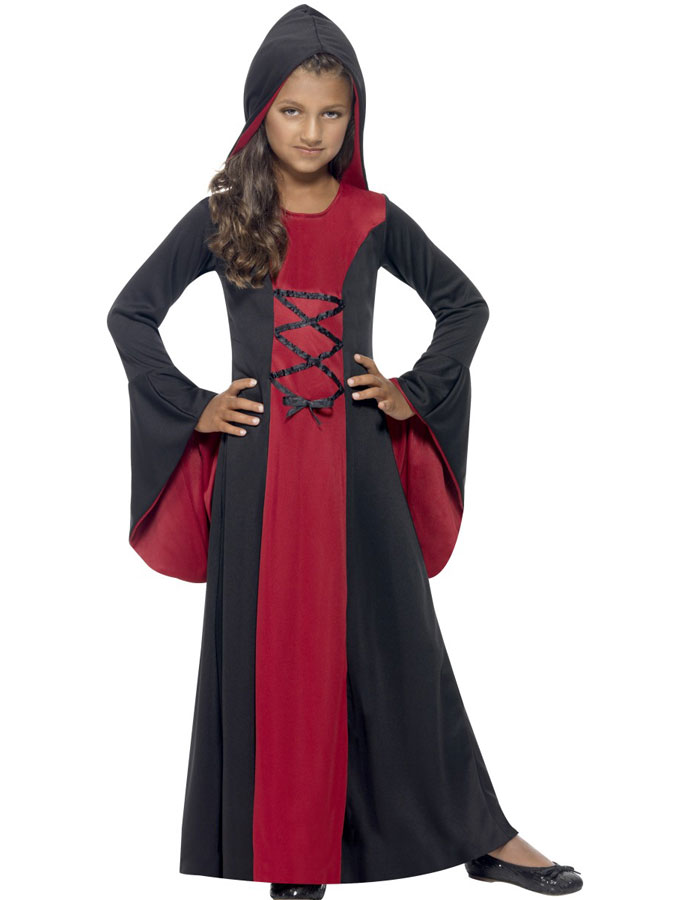 Mystisk Vampyrdräkt Barn omfattar en svart/röd vampyrklänning med draperade ärmar, snörningsdetaljer och en fastsatt huva.