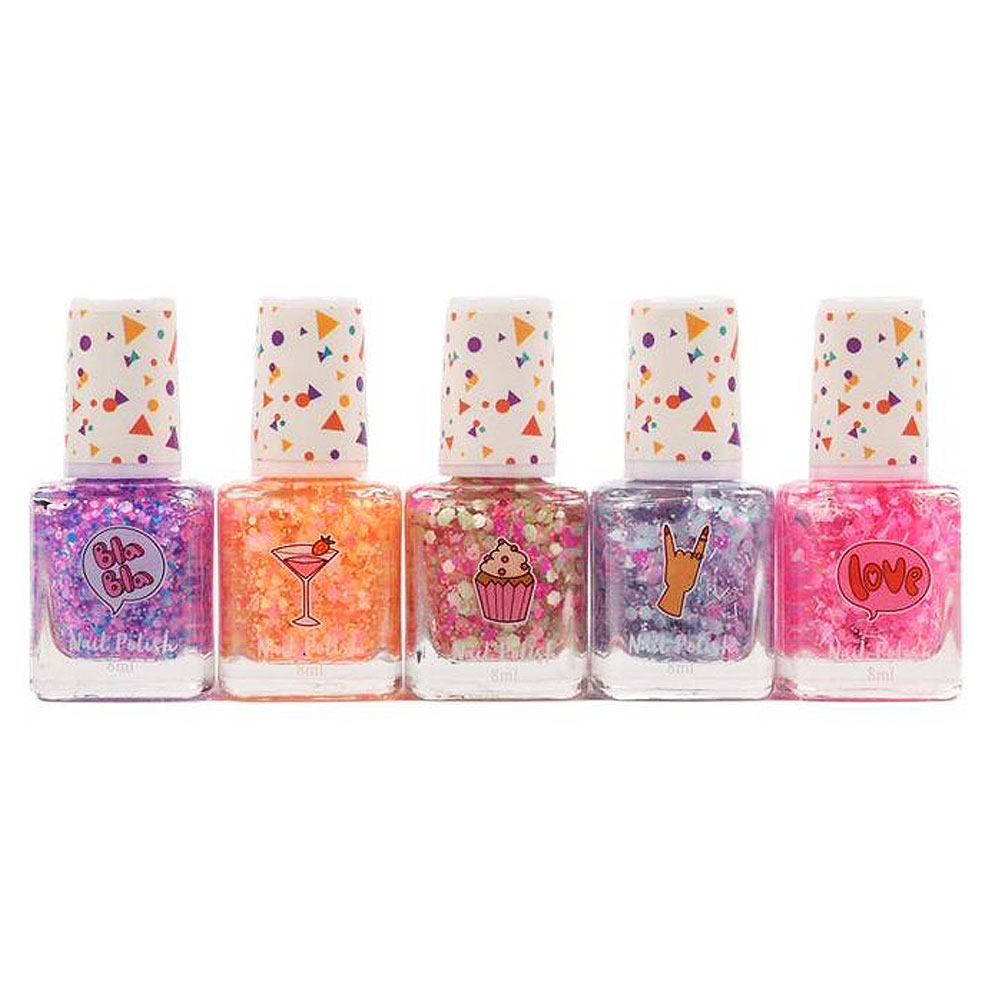 Festligt nagellack set som låter ditt barn gör sig riktigt fin! Detta barn-nagellack kit kommer med fem stycken skimrande konfetti-nagellack i grönt, blått, lila och olika rosa nyanser som passar perfekt för alla barn som önskar färgglada, glittriga naglar. Välj den färg du tycker är finast eller måla alla naglarna i olika färger för en extra färgglad look.