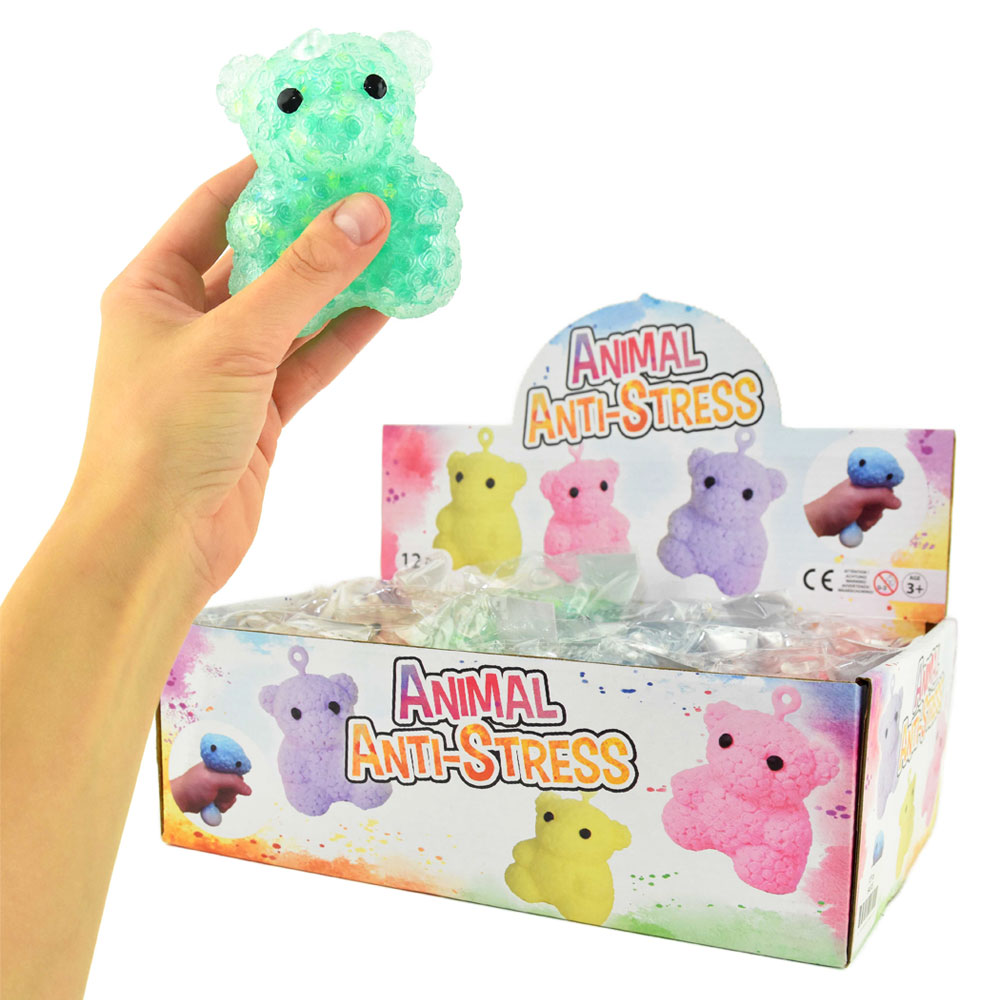 Nalle Klämdjur omfattar en genomskinlig klämvänlig stressboll formad som en nallebjörn med färgade bubblor och glansiga små paljetter intui. Klämdjuret är ca 9,5 cm hög och 7 cm bred, är tillverkad i gummimaterial och har en plastögla på huvudet. Nallen finns i blått, grönt, orange och rött, vilken du får blir en överraskning.