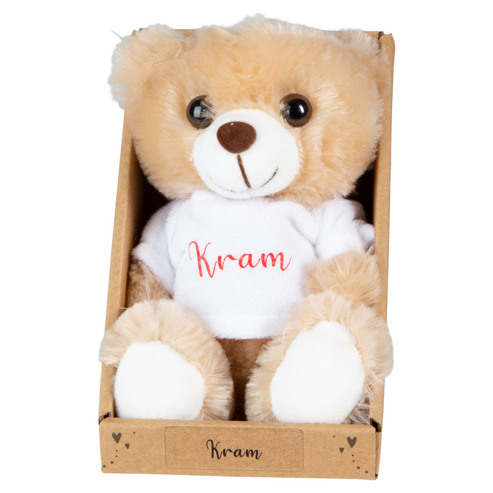 Nalle Kram T-Bear omfattar en beige-färgad nallebjörn med en vit tröja på sig med texten "Kram" i rött. Nallen är tillverkad av polyester och är ca 15 cm stor.