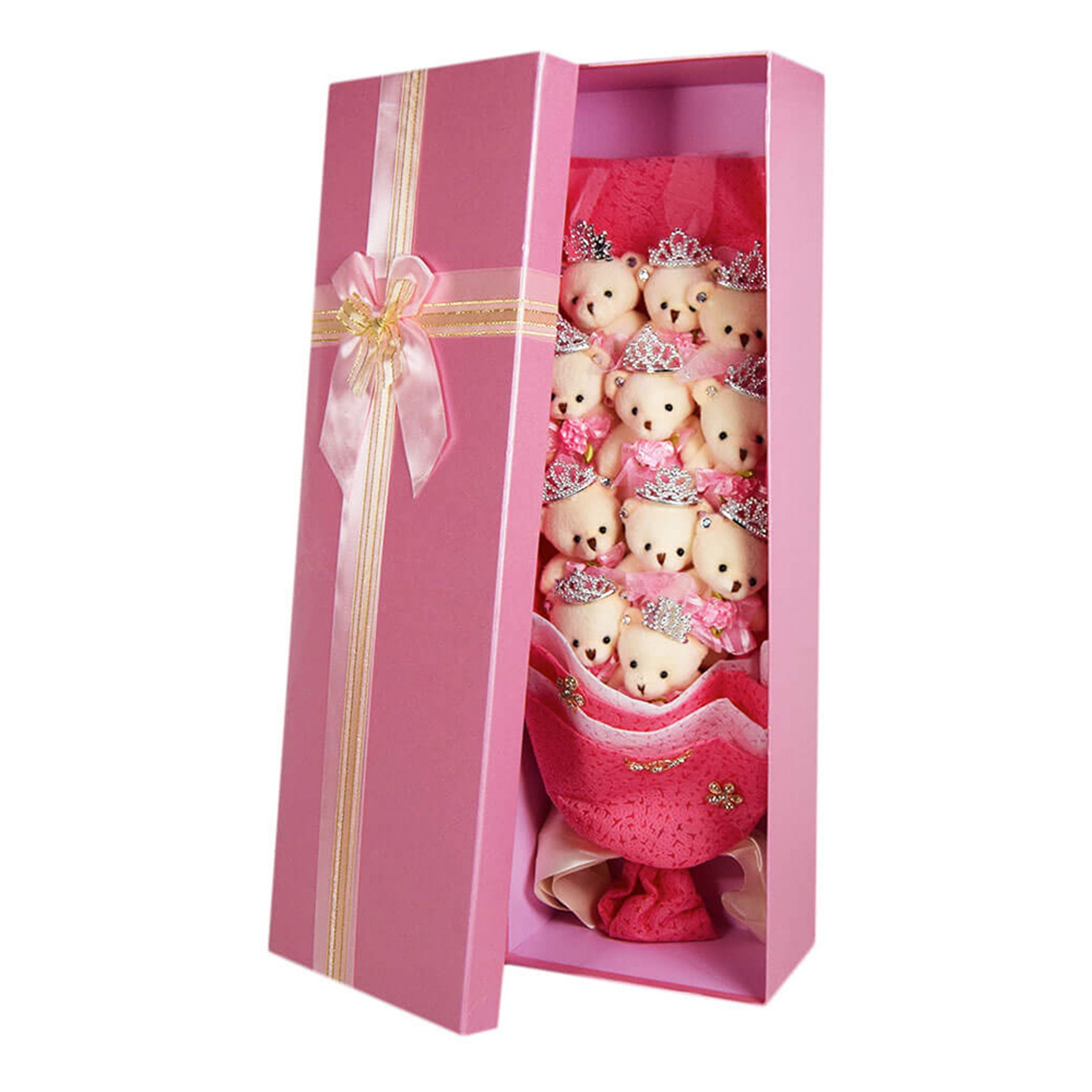 Nallebukett är precis som en bukett med rosor, fast med massa små nallebjörnar istället. Att ge bort denna till en crush, till din all time lover eller till mamsen kommer gå hem 11/10 gånger! Nallebuketten innehåller totalt 11 stycken nallar med små tiaror på huvudet och nallarna är inlindade i ett vacker rosa omslagspapper. Buketten levereras i en matchande rosa låda med rosett.
