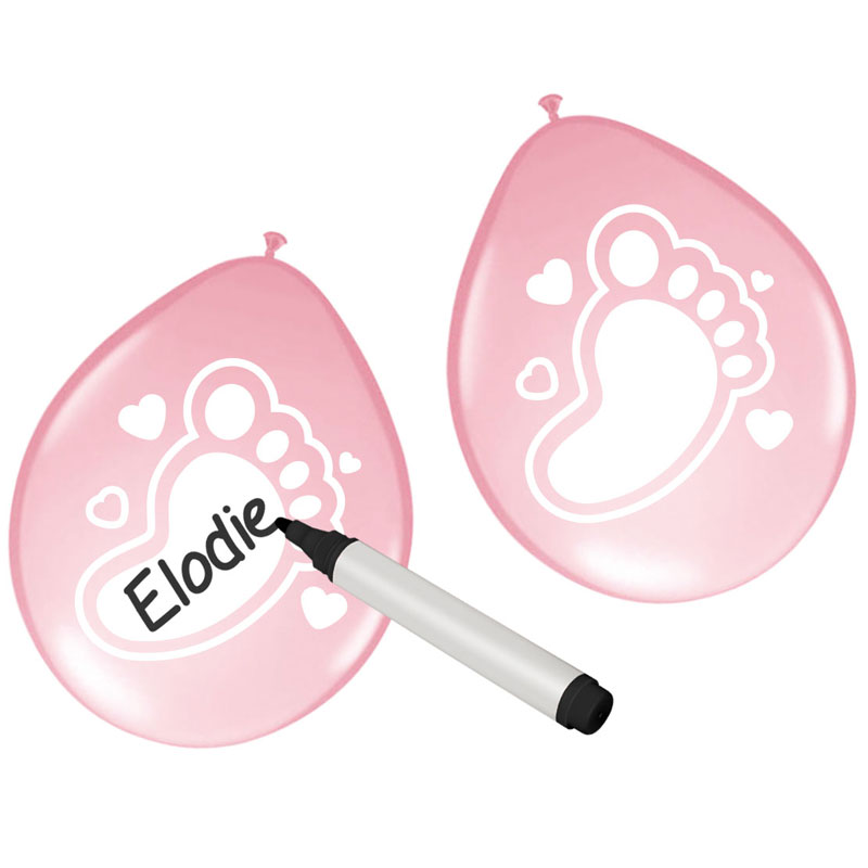 Namnballonger Baby Girl omfattar ballonger i ljusrosa med vita detaljer och motiv av små fötter där du kan skriva barnets namn eller en hälsning med en tuschpenna.