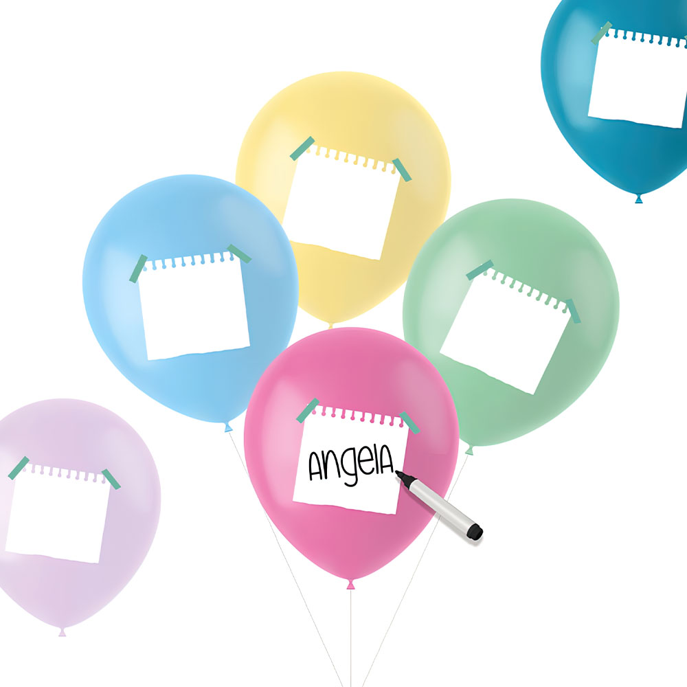 Namnballonger Pastell omfattar ett 6-pack med pastellfärgade latexballonger med motiv av små vita lappar där du kan skriva olika namn eller meddelanden. Ballongerna fylls med helium eller luft, rymmer ca 15 liter och blir ca 33 cm stora.