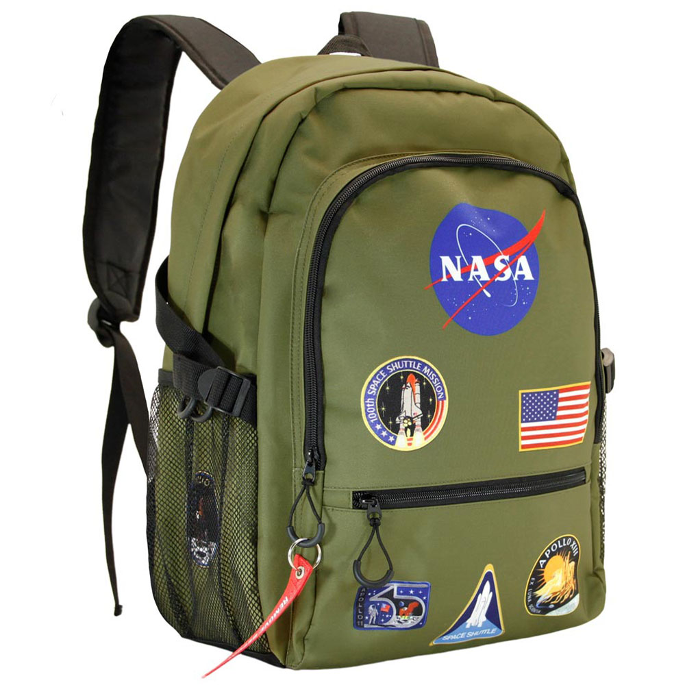 NASA Ryggsäck Khaki omfattar en khaki ryggsäck med NASA-motiv. Ryggsäcken har ett svart bärhandtag, justerbara vadderade svarta axelband, två svarta nätfack på sidorna, ett orange laptopfack och tre fack med dragkedjor, inklusive ett huvudfack och två framfack.