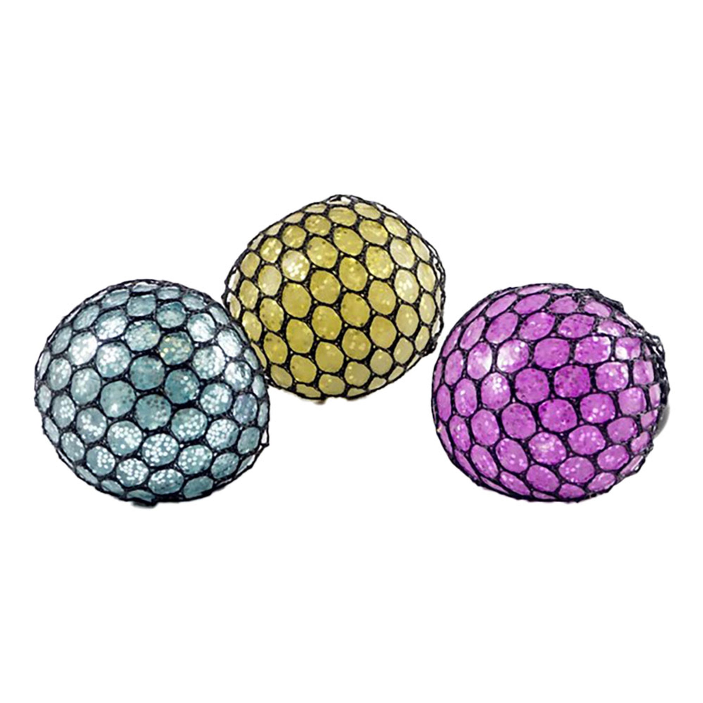 Detta är en superkul boll att leka med. När man klämmer på den kommer det ut slime mellan nätet. Bollen kan också användas som stresslindrande effekt.