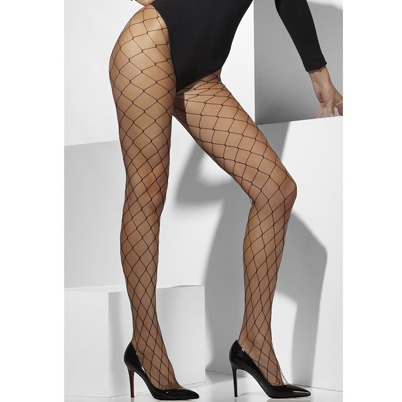Svarta nätstrumpbyxor med stora maskor föreställande diamanter.