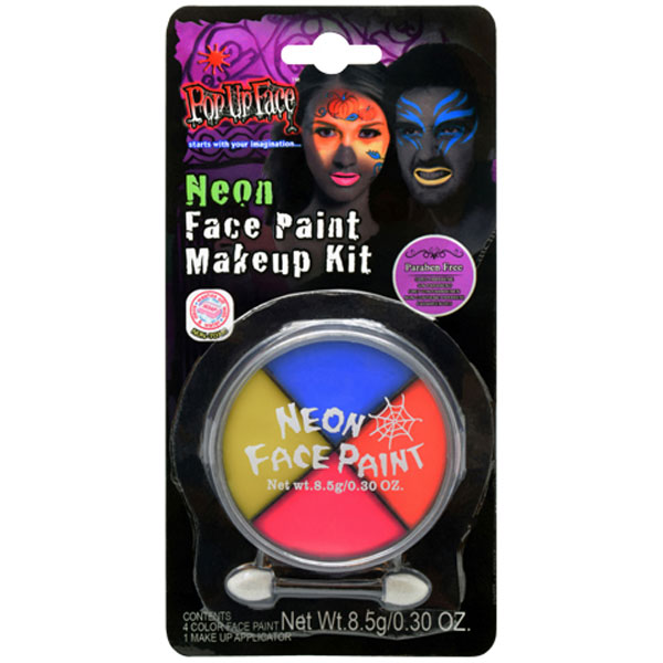 Neon Ansiktsfärg Set innehåller en sminkpalett med neonfärgerna blå, orange, rosa och gul, samt en applikator. Sminket tvättas enkelt bort med tvål och varmt vatten. Praktiskt palett som är lätt att ta med sig för den som gillar att bättra på under kvällen.