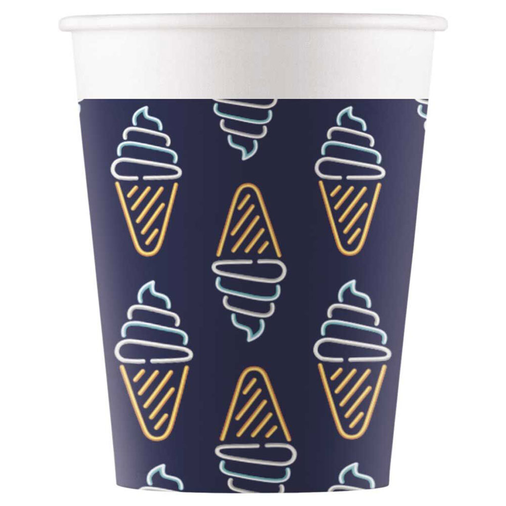 Neon Party Muggar omfattar ett 8-pack engångsmuggar i vitt och mörkblått med motiv av blå och gula neon-glasstrutar. Muggarna är tillverkade av papp.