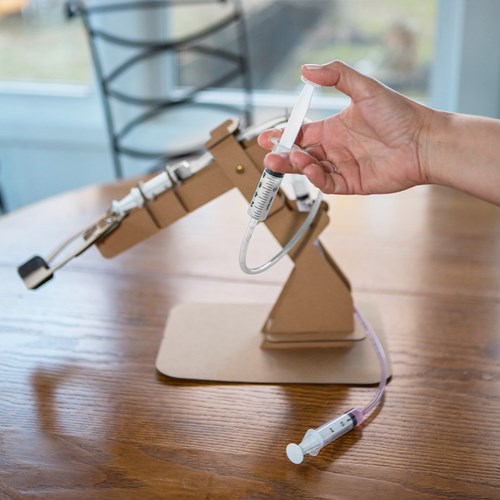 I kittet ingår stansade kartongbitar, pvc slangar, 10 ml sprutor samt skruvar. Använd materialet för att bygga ihop din hydrauliska klo. Allt som behövs för att vrida och vända på armen är vatten. Se hur processen av kraft och vätsketryck skapar rörelse!