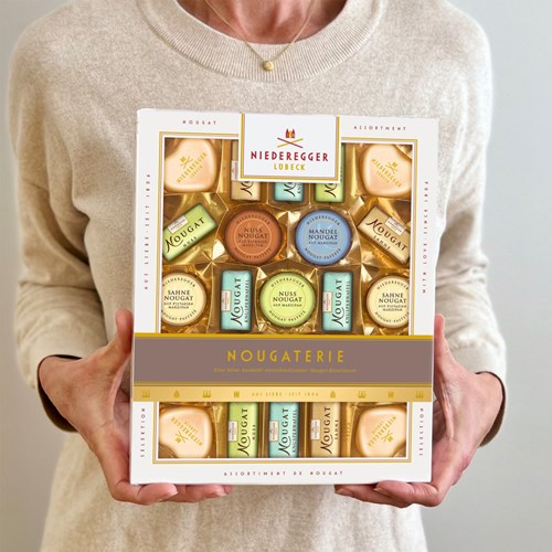 Denna tjusiga presentask innehåller 23 bitar otroligt mjuk nougat och marsipan i olika smaker som gräddnougat, krispig våffelnougat, nötnougat, marsipannougat och espressonougat! En nougatälskares dröm!