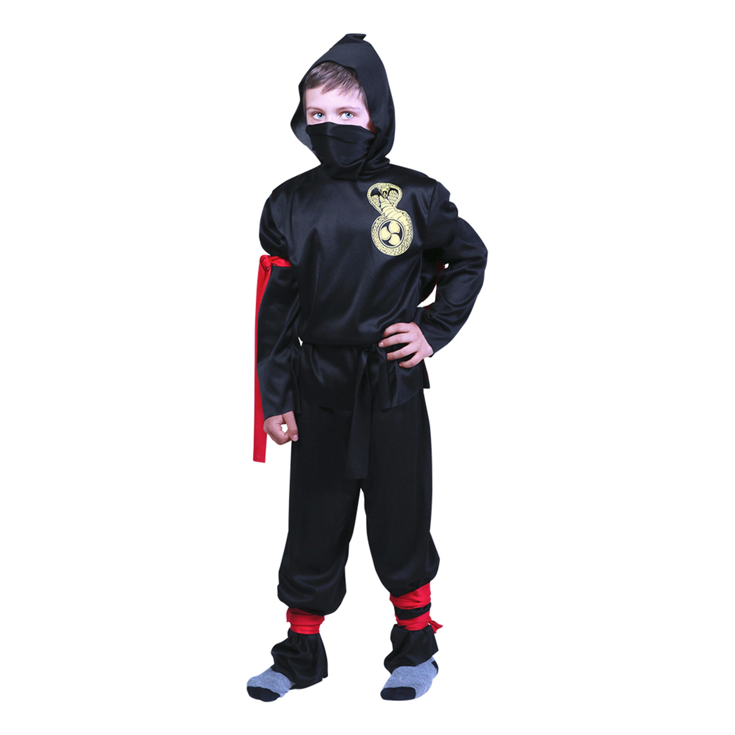 Ninja Budget Barn Maskeraddräkt består av en svart tröja med huva, med en gul orm på bröstets vänstra sida, svarta byxor med röda band längst ner på benen, en röd armbindel och slutligen ett svart bälte.