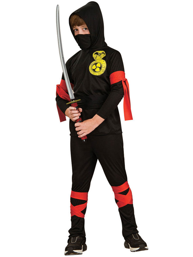 Ninjadräkt Barn består av en svartfärgad, långärmad huvtröja med en kobra-symbol tryckt vid vänster bröstparti. Det medföljer även ett par matchande byxor med resårband kring midjan, en svart scarf som täcker nedre delen av ansiktet, samt ett midjeband som hjälper till med passformen.
