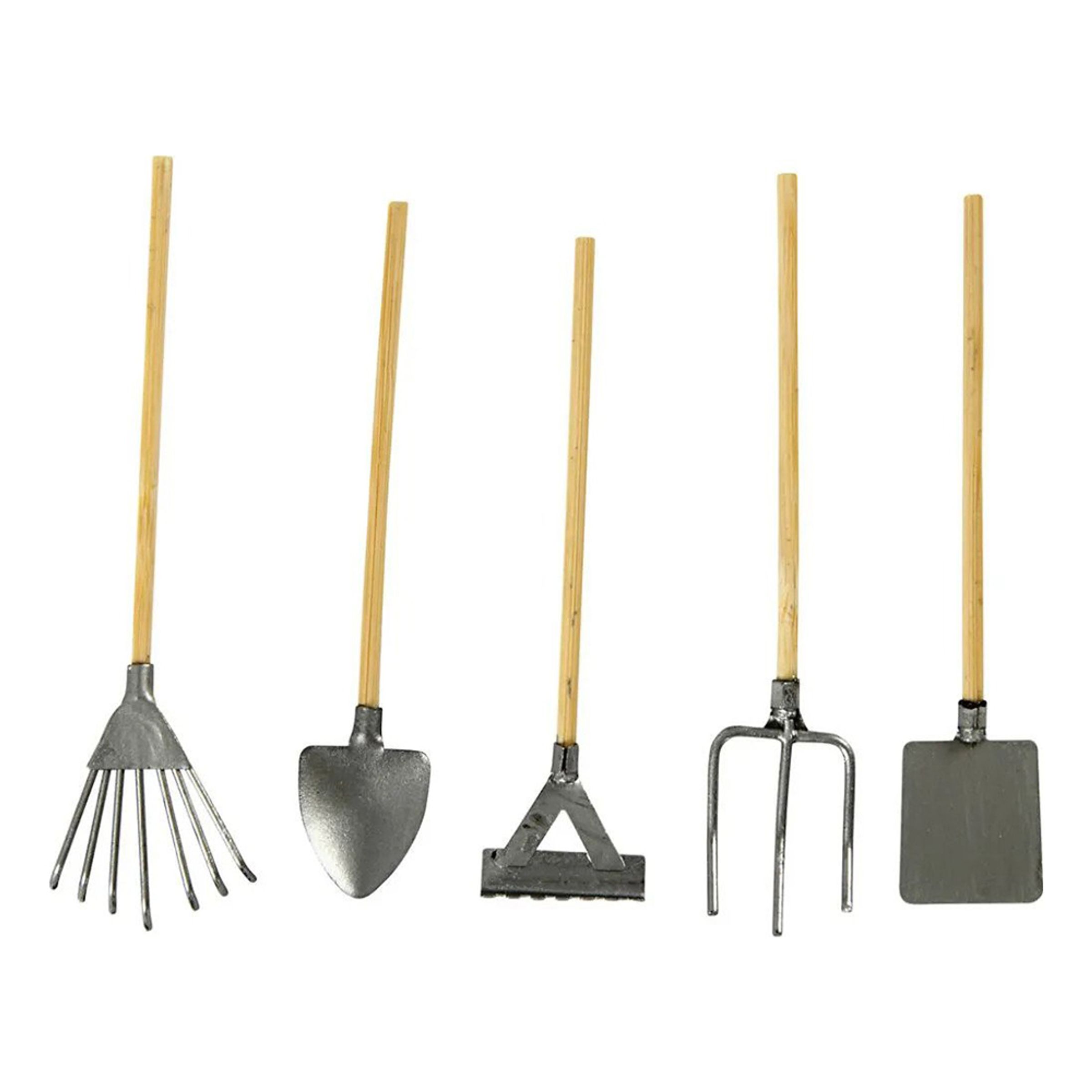 Nissedörr Trädgårdsredskap inkluderar fem stycken redskap i metall med träskaft. Passar perfekt att dekorera med utanför Nissens dörr eller i minilandskapet.