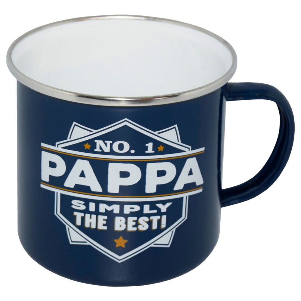 No 1 Pappa Retro Mugg omfattar en mörkblå mugg med vit insida av emaljerad plåt som pryds av texten "No. 1 Pappa Simply The Best" i vitt med guldiga stjärnor. Muggen är ca 9 x 9,5 cm stor.